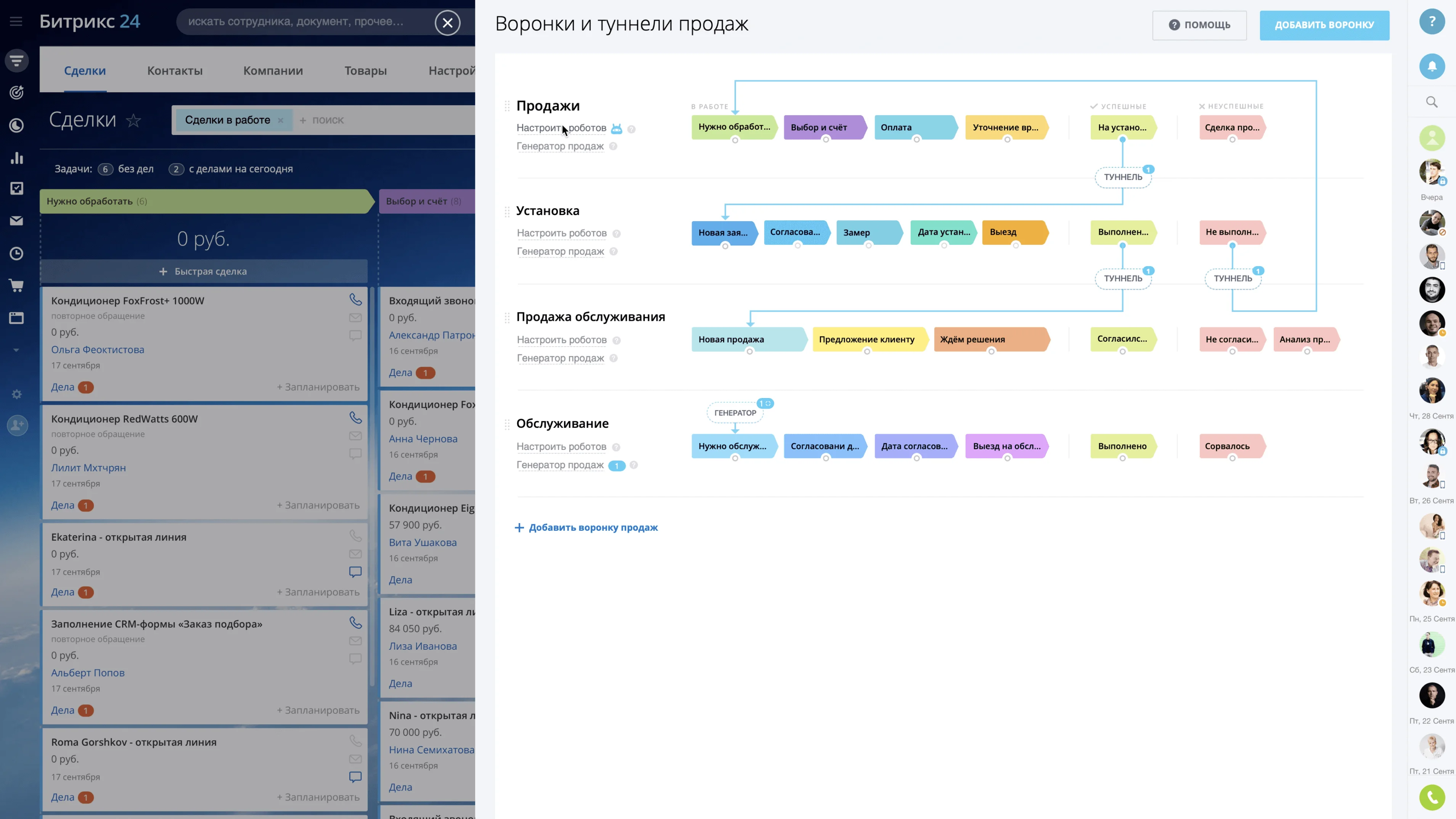 Туннели продаж. Счастье для маркетологов, отдела продаж, всей компании :)) Визуальная понятная настройка воронок и стадий с возможностью подключать внешних чат-ботов и активировать повторные продажи. Просто нарисуйте путь покупателя от одной стадии продажи к следующей, а Битрикс24 автоматизирует всё по вашему сценарию.