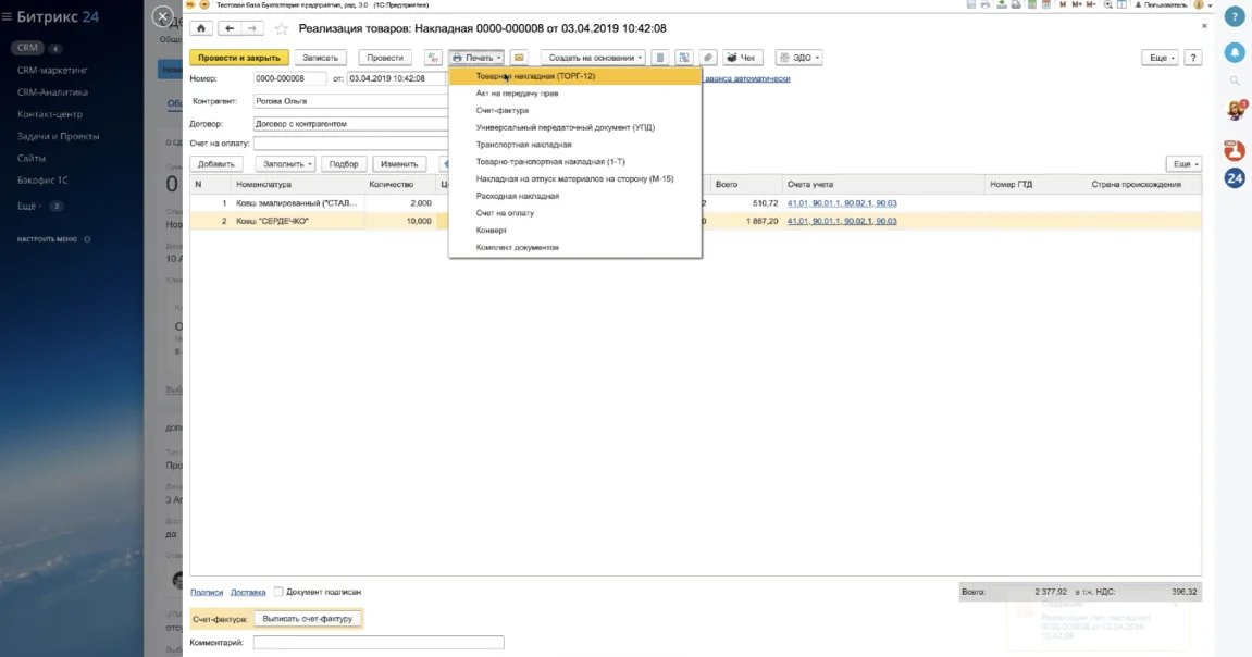 Бэкофис 1С. Не выходя из Битрикс24, открывайте 1С прямо в карточке CRM. Заполняйте накладные, формируйте счета и акты в привычном интерфейсе 1С и отправляйте их клиенту. Все документы сохраняются в 1C и в Битрикс24.