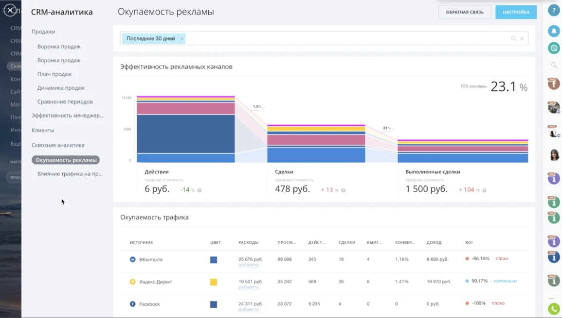 Сквозная аналитика. Впервые в мире CRM считает эффективность расходов на рекламу. Битрикс24.CRM покажет вам, откуда пришел клиент, даже если это непрямой путь от поиска в Яндексе до сообщения в чат ВКонтакте:) а еще, сколько вам стоило привлечение этого клиента. И так по всем рекламным каналам! Даже офлайн (вручную создаете канал, указываете расходы).