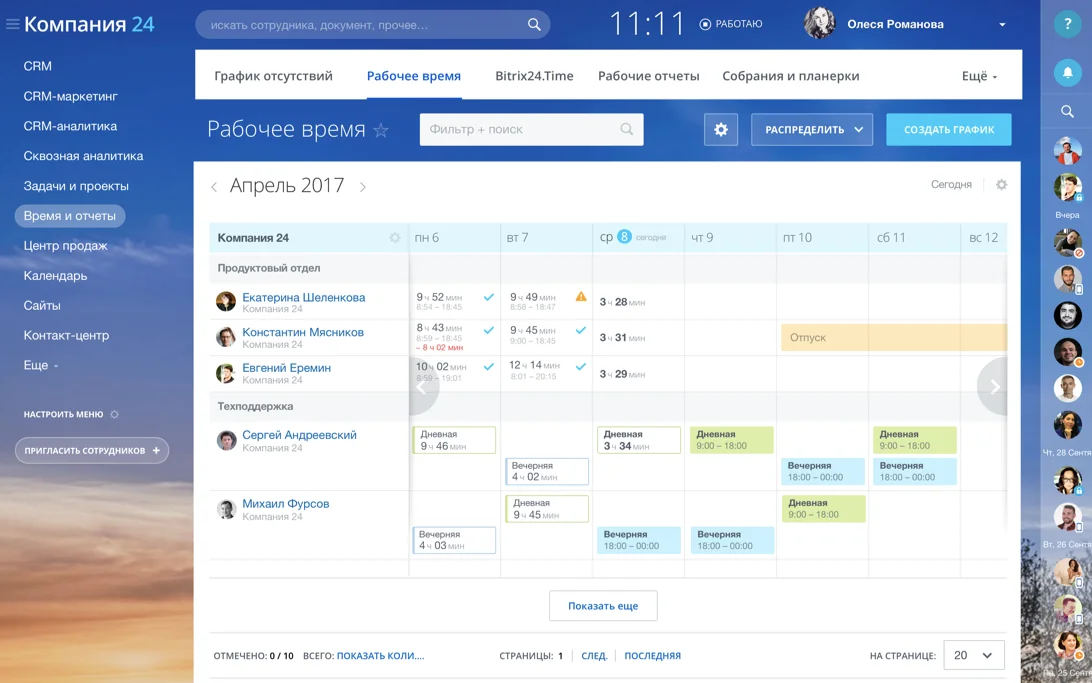 Рабочее время. Мы учли четыре сценария организации труда: посменная работа, почасовой или фиксированный графики учёта времени, смешанный режим.