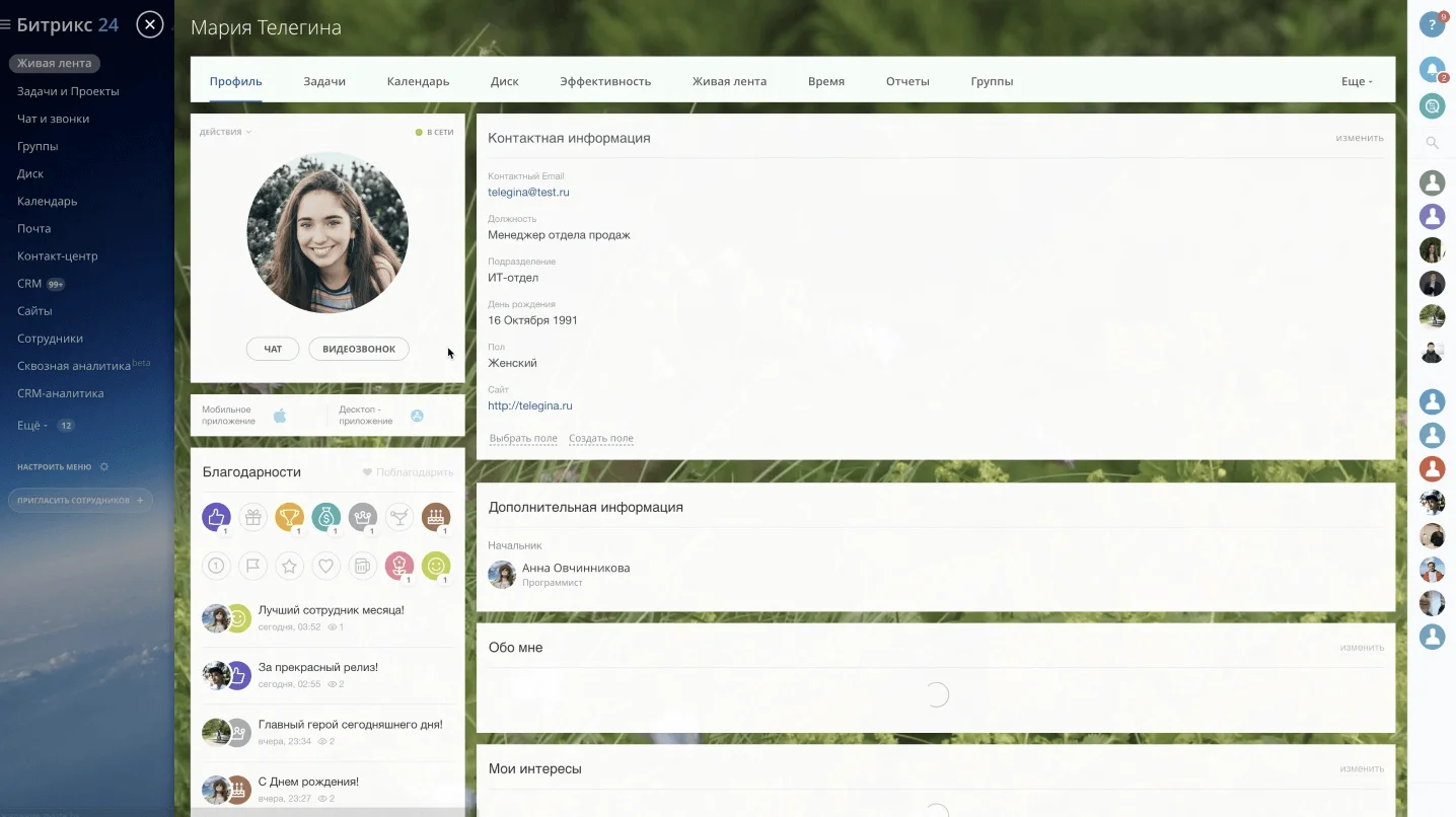 Новый профиль сотрудникаТеперь коллеги могут показать себя и свои интересы, найти единомышленников, используя теги интересов. К тому же Профиль хранит все заслуги и благодарности сотрудника, опубликованные когда-либо в Живой ленте.