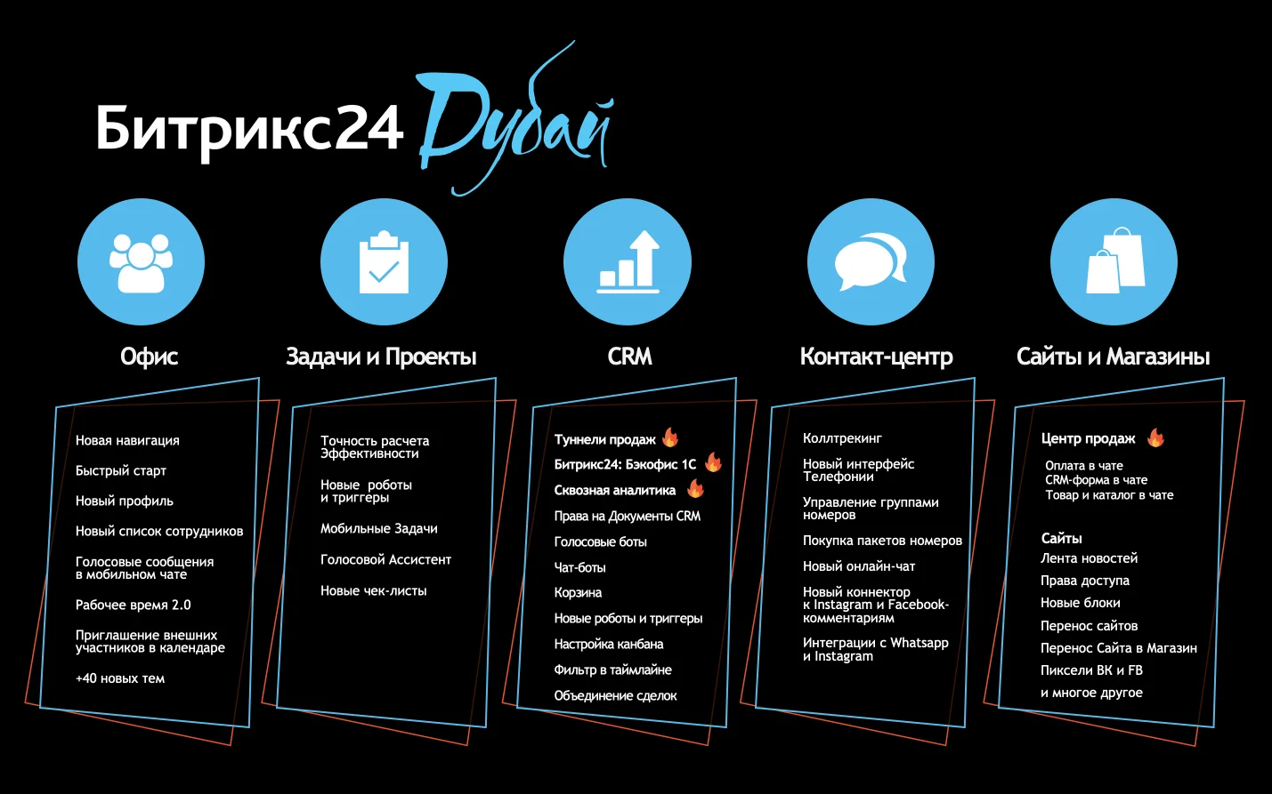 Битрикс24.Дубай это более 100 огненных решений для вашего бизнеса. В новом Битрикс24 появятся Центр продаж, Туннели продаж, новая Сквозная аналитика, Бэкофис 1С. А так же много нового в Задачах, Сайтах, Контакт-центре и Офисе.