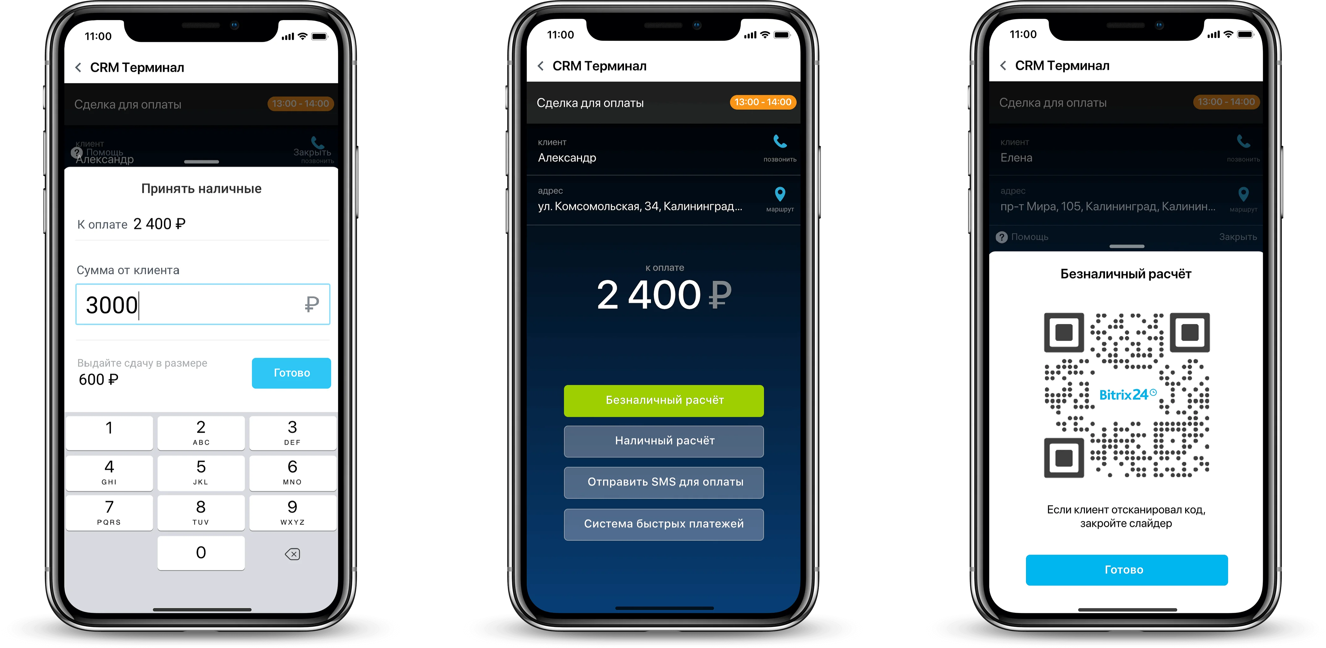 Вам не придется покупать каждому курьеру банковский терминал. Вместо этого используйте смартфон с приложением Битрикс24. CRM-Терминал позволит на месте оформить заказ, принять оплату наличными, по карте, SMS или QR-коду.