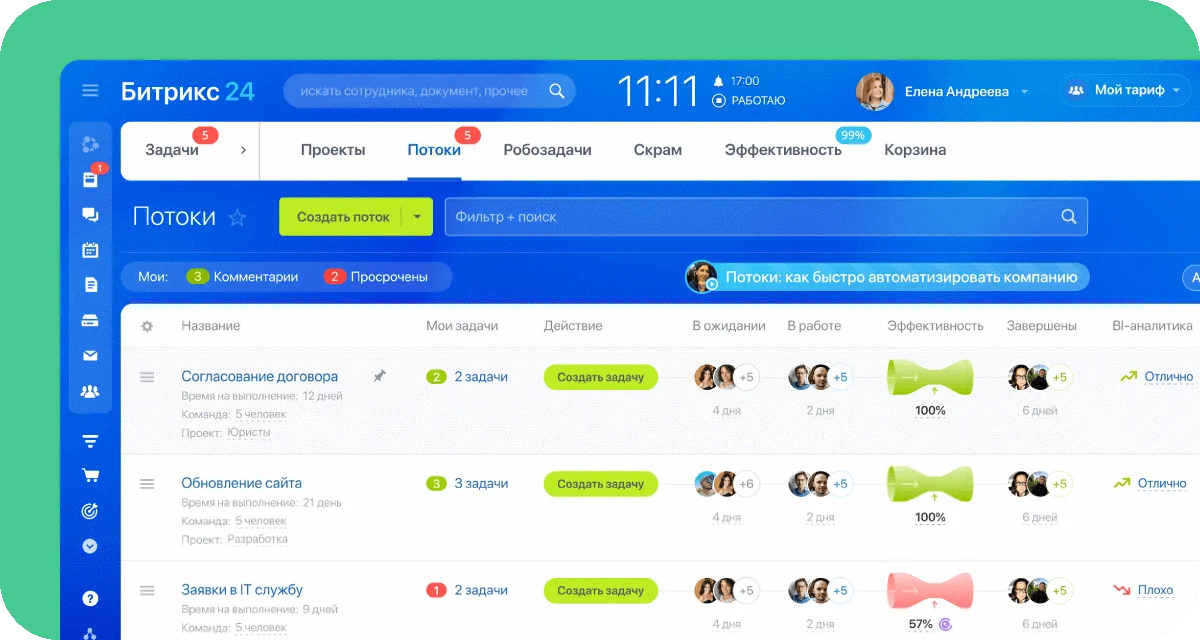Визуализируйте рабочие процессы и находите узкие места до того, как что-то сломается. Создавайте потоки для типовых задач отделов, чтобы гибко распределять нагрузку и сохранять контроль над ситуацией.