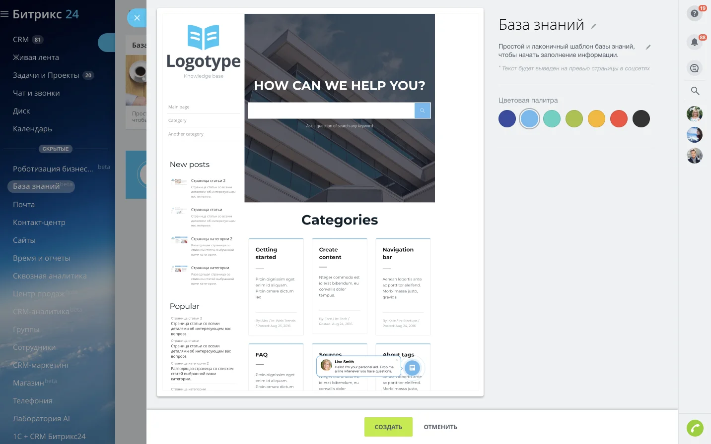 Наша разработка основана на понятном и знакомом пользователю материале – путь создания сайтов в Битрикс24. Теперь ваши сотрудники, знакомые с работой инструмента Сайты, будут с легкостью делиться своим опытом и наработками компании, создавая и редактируя страницы Базы знаний. Подробнее