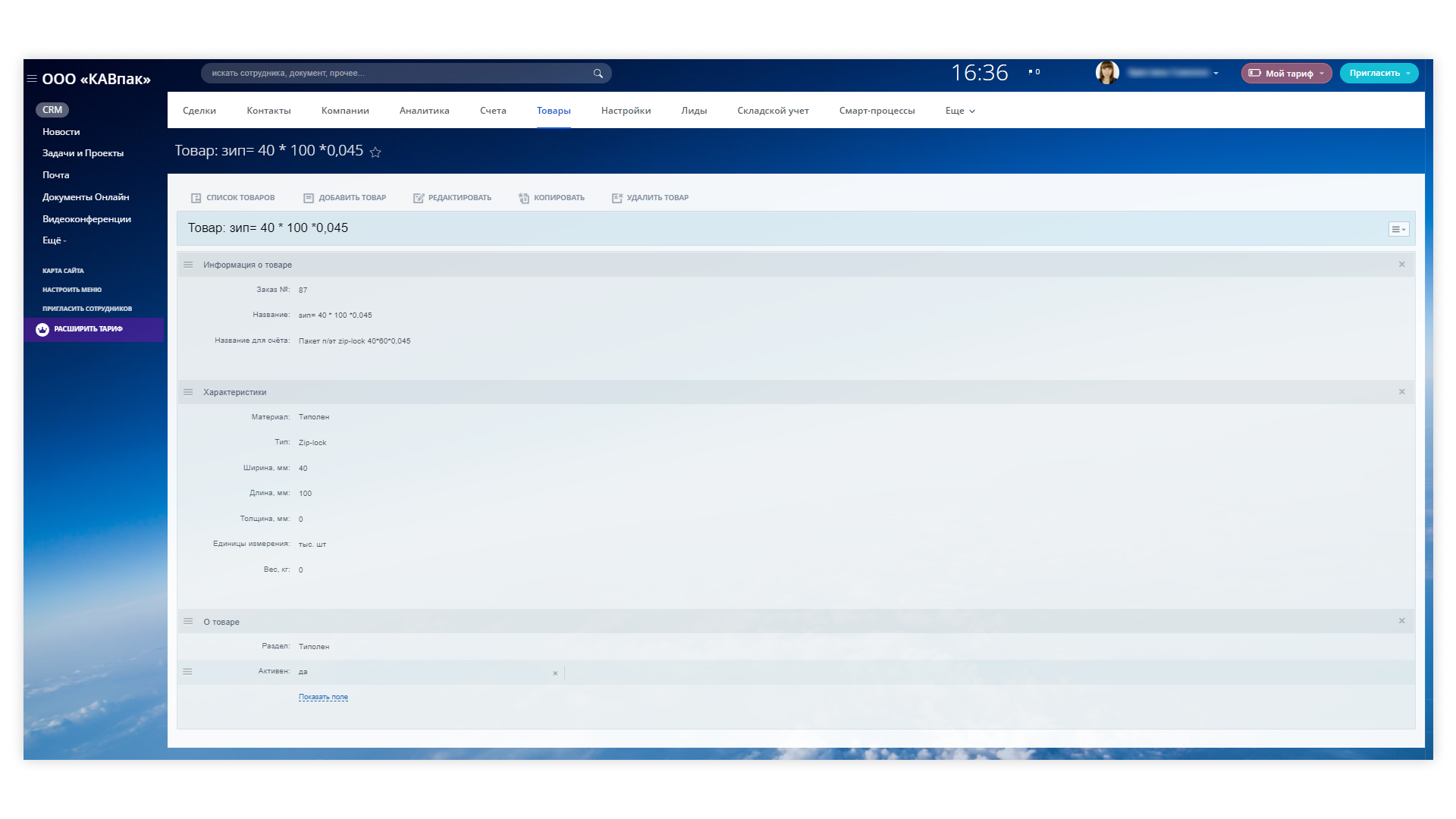 Настроили пользовательские поля в карточке товаров. В характеристиках продукции теперь есть тип товара, вид материала, длина, ширина и толщина, вес и единица измерения.