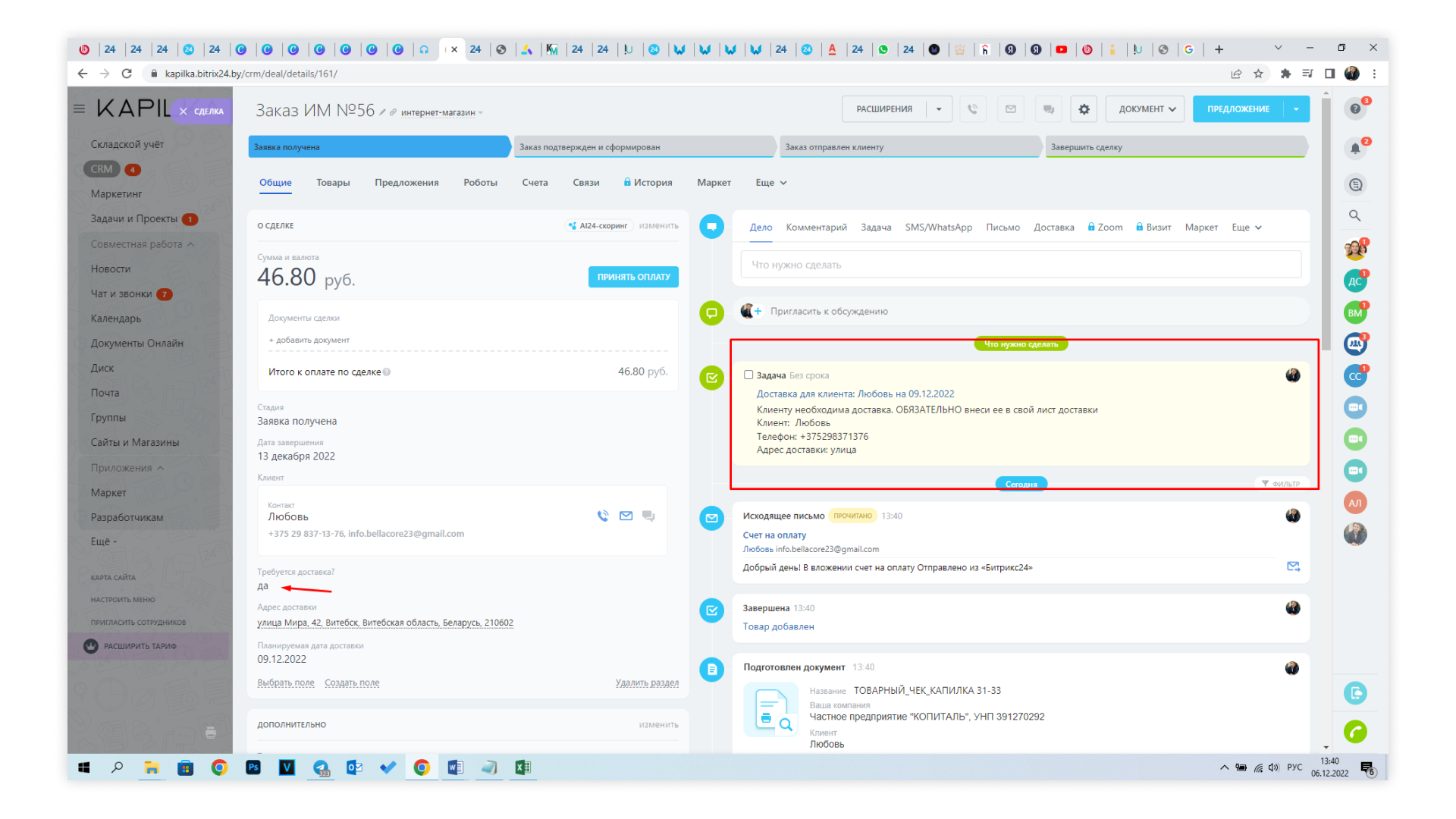 В результате их получилось две. Первая – для продавцов. Чтобы менеджеры могли быстро фиксировать все сделки в CRM, мы сократили количество этапов до минимума: чек открыт – товар подобрали– чек закрыт. После закрытия чека продавец в CRM отмечает галочкой, нужна ли доставка. Роботы автоматически цепляют информацию о заказе (товар и контактные данные покупателя) и ставят задачу курьерам. Параллельно автоматически формируется пакет необходимых документов. Напомню, что курьеры в компании наемные, к общему порталу Битрикс24 мы подключаем их через экстранет и в своем мобильном приложении водители видят только свои задачи на доставку.