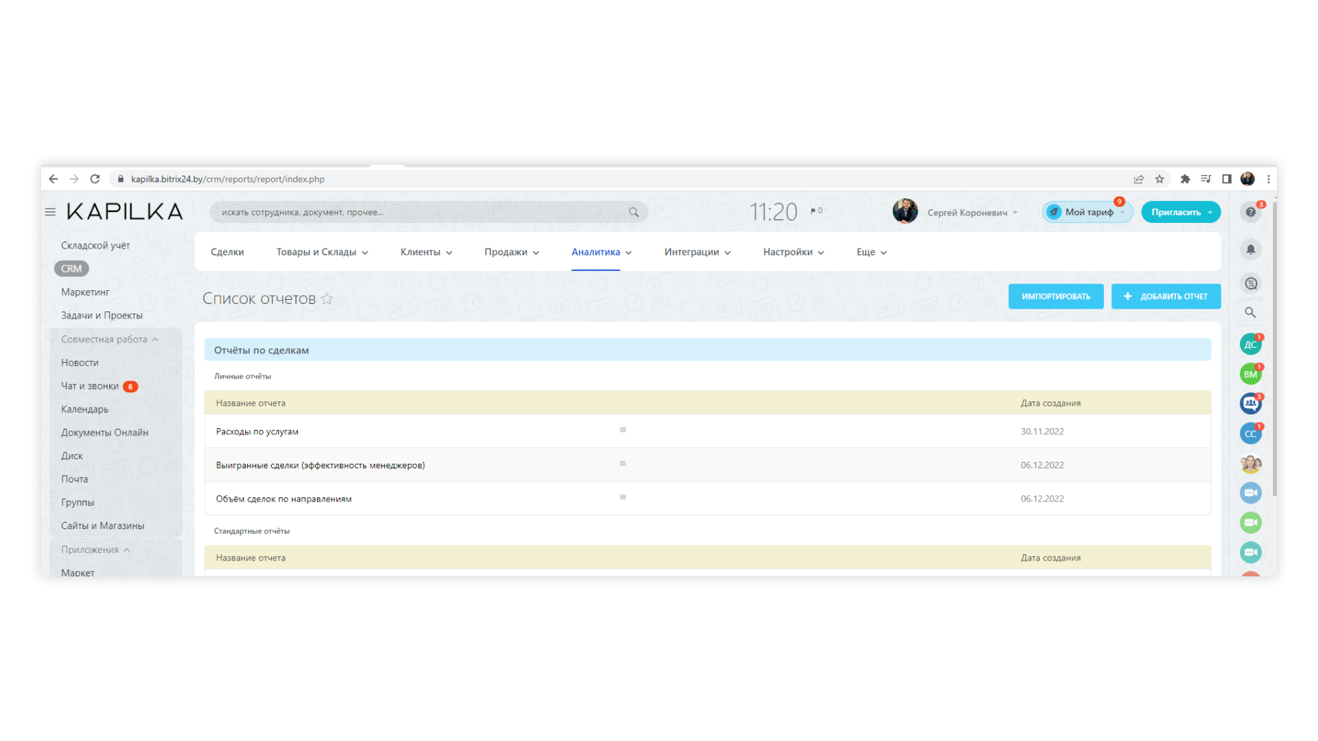 Создали и настроили аналитические отчеты для руководителей и сотрудников. В результате руководитель может оценить рост продаж, эффективность менеджеров, вклад в продажи каждого сотрудника. Менеджер по продажам может оценить процент выполнения плана продаж, проанализировать товарную матрицу на предмет самых продаваемых товаров.