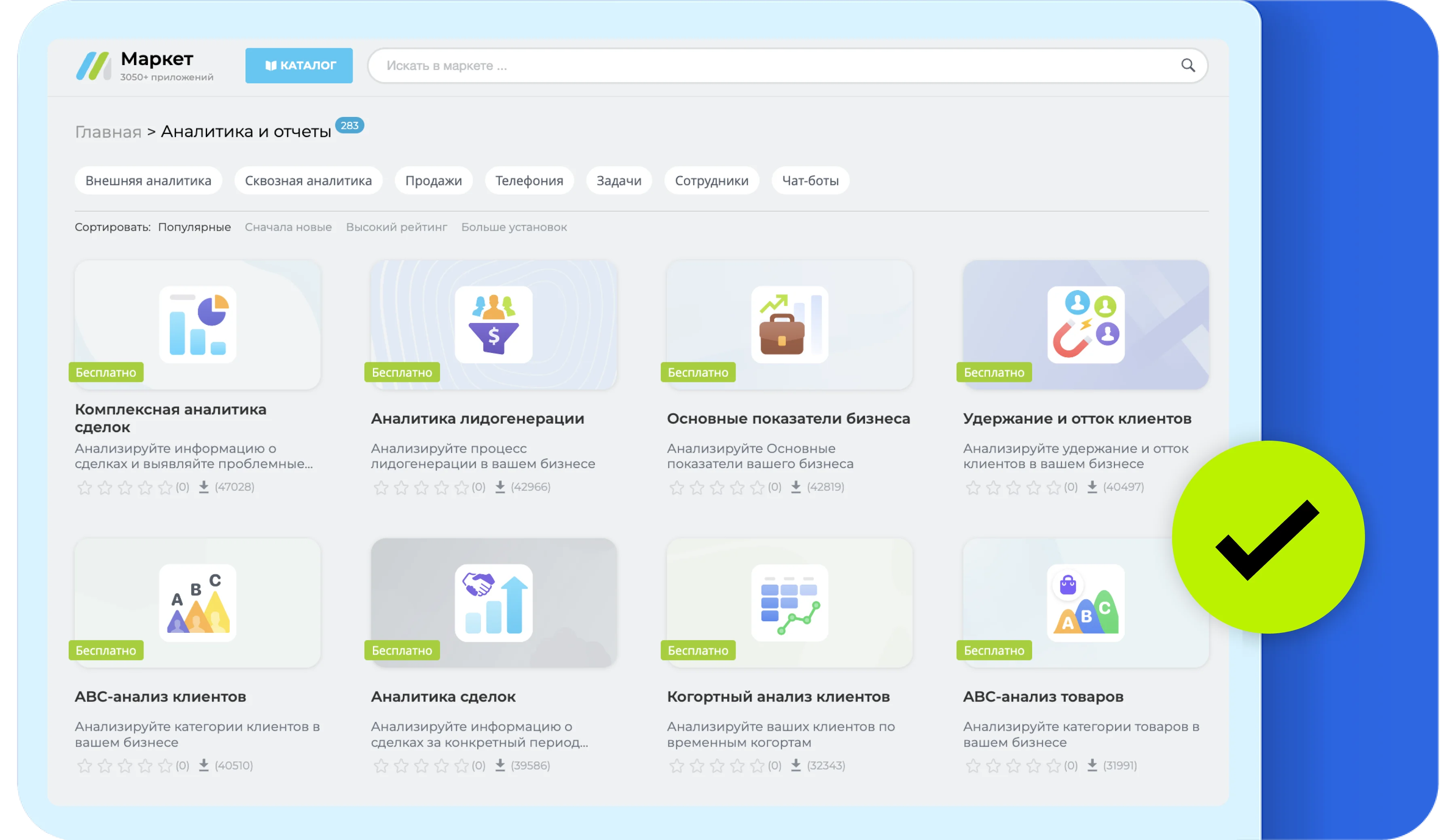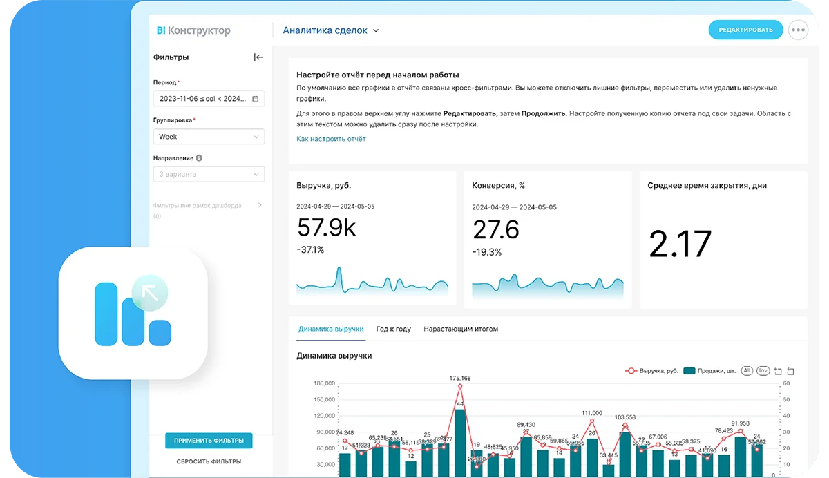 BI Конструктор Битрикс24 содержит всю инфраструктуру для настройки полной аналитики и не требует подключения сторонних сервисов.