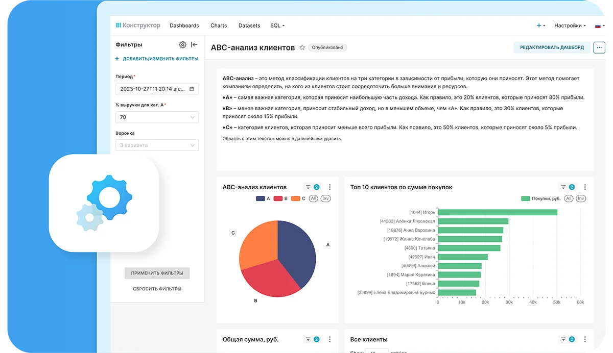 Формируйте свои дашборды с отчетами, настраивайте графики, добавляйте наборы данных. При помощи SQL-запросов объединяйте информацию из разных таблиц.