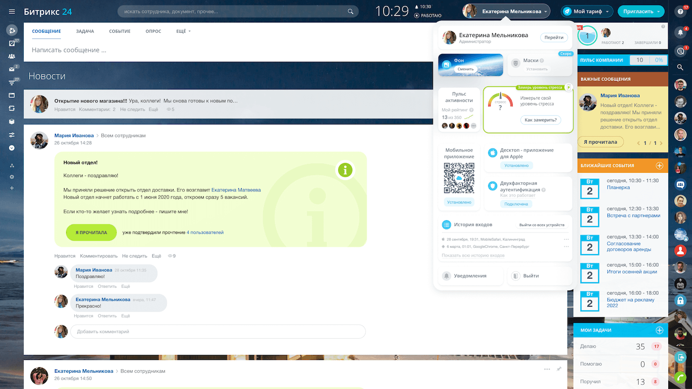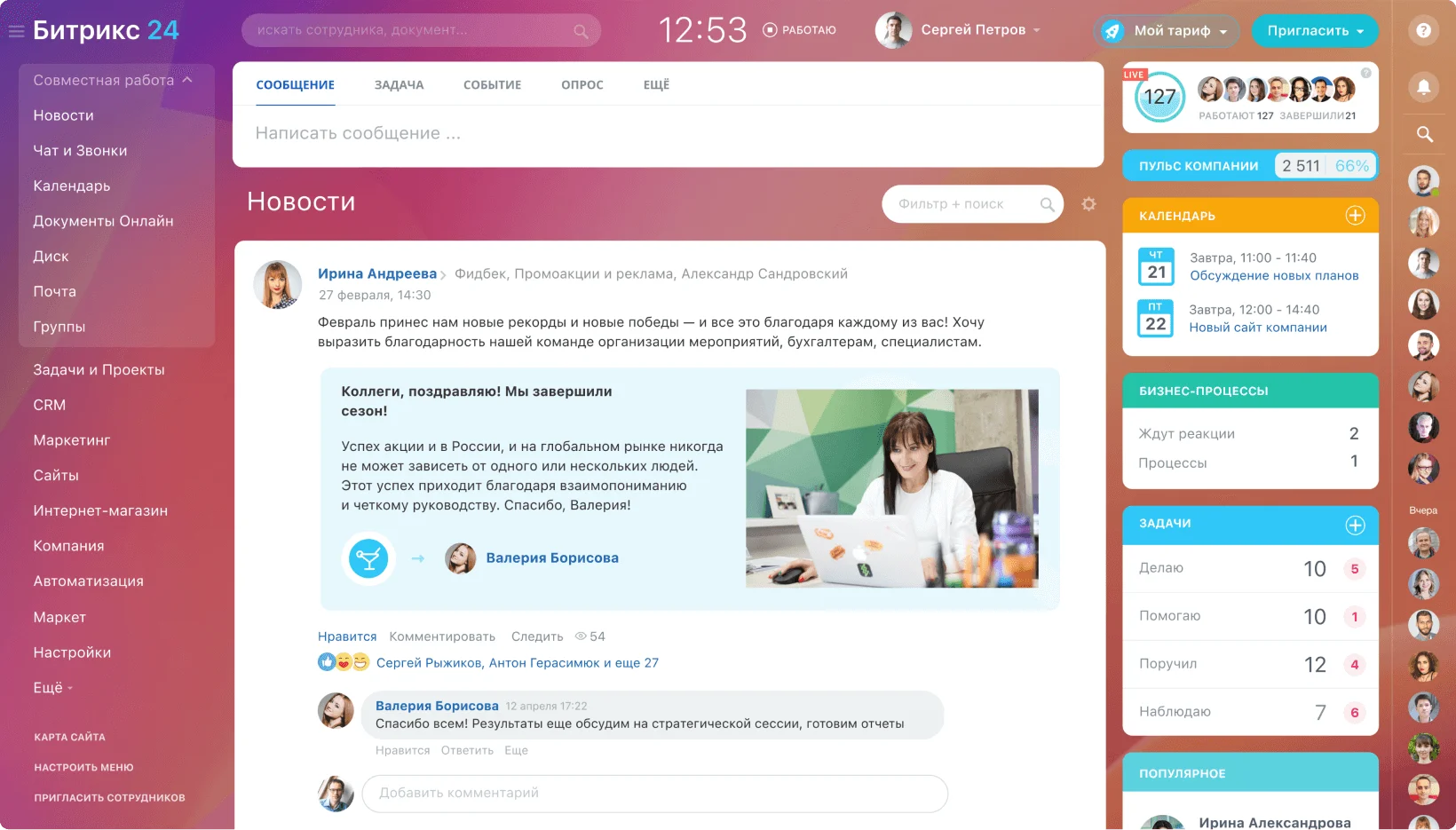Новостная лента может стать местом, где кипит жизнь в компании. Прямо из поста создавайте задачи, проводите опросы, делитесь эмоциями.