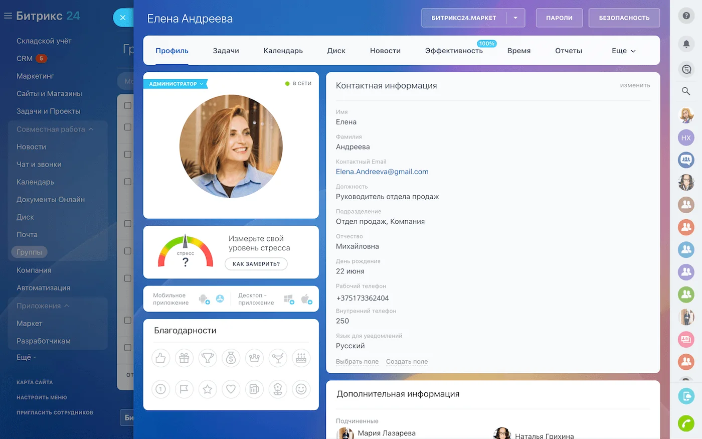 Профиль хранит контакты, информацию о руководителе и подчиненных, заслуги и благодарности сотрудника, опубликованные когда-либо в новостной ленте.