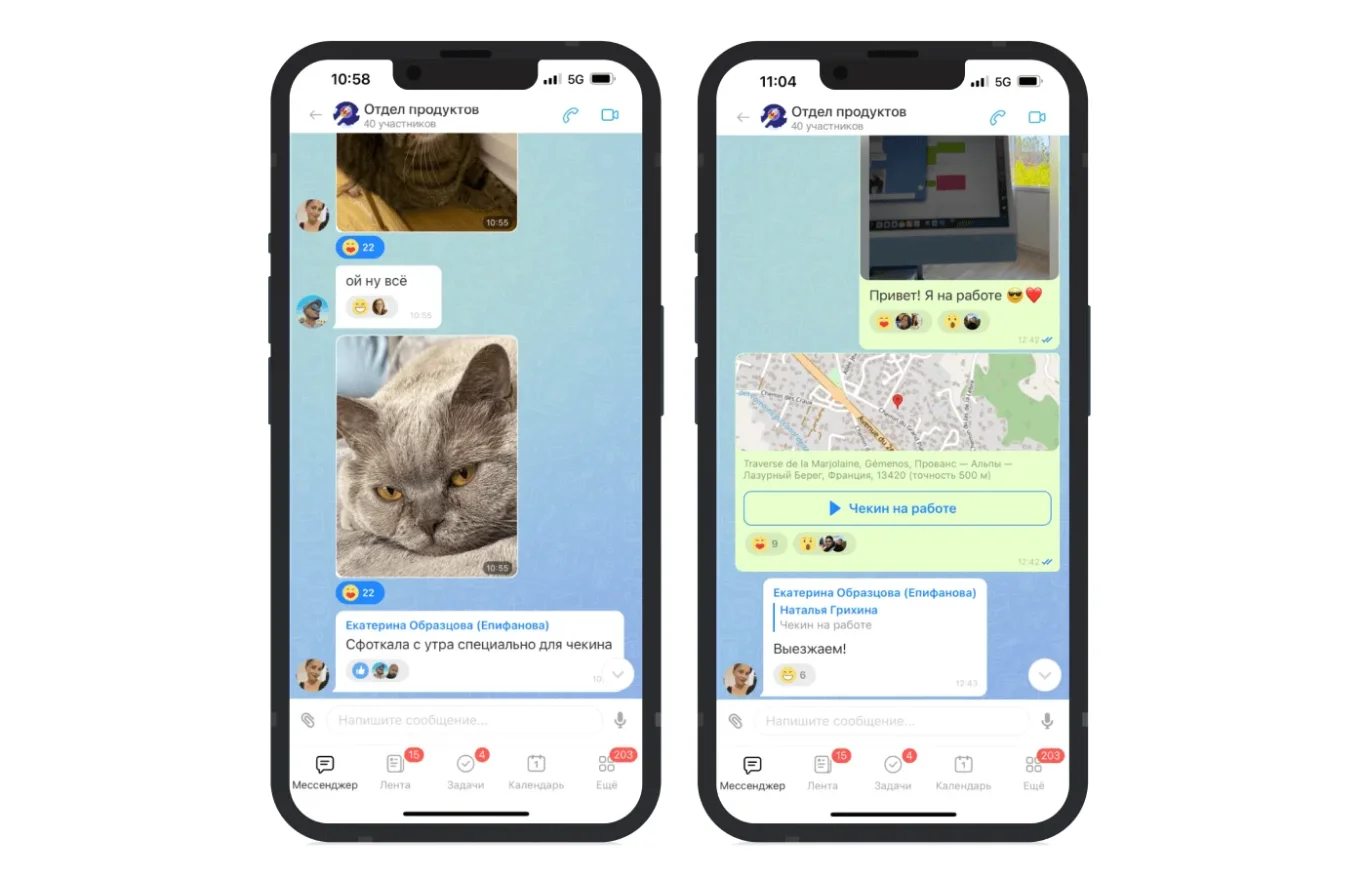 В Чатах вы можете общаться лично или в группах, проводить созвоны, ставить лайки и реагировать на сообщения коллег.