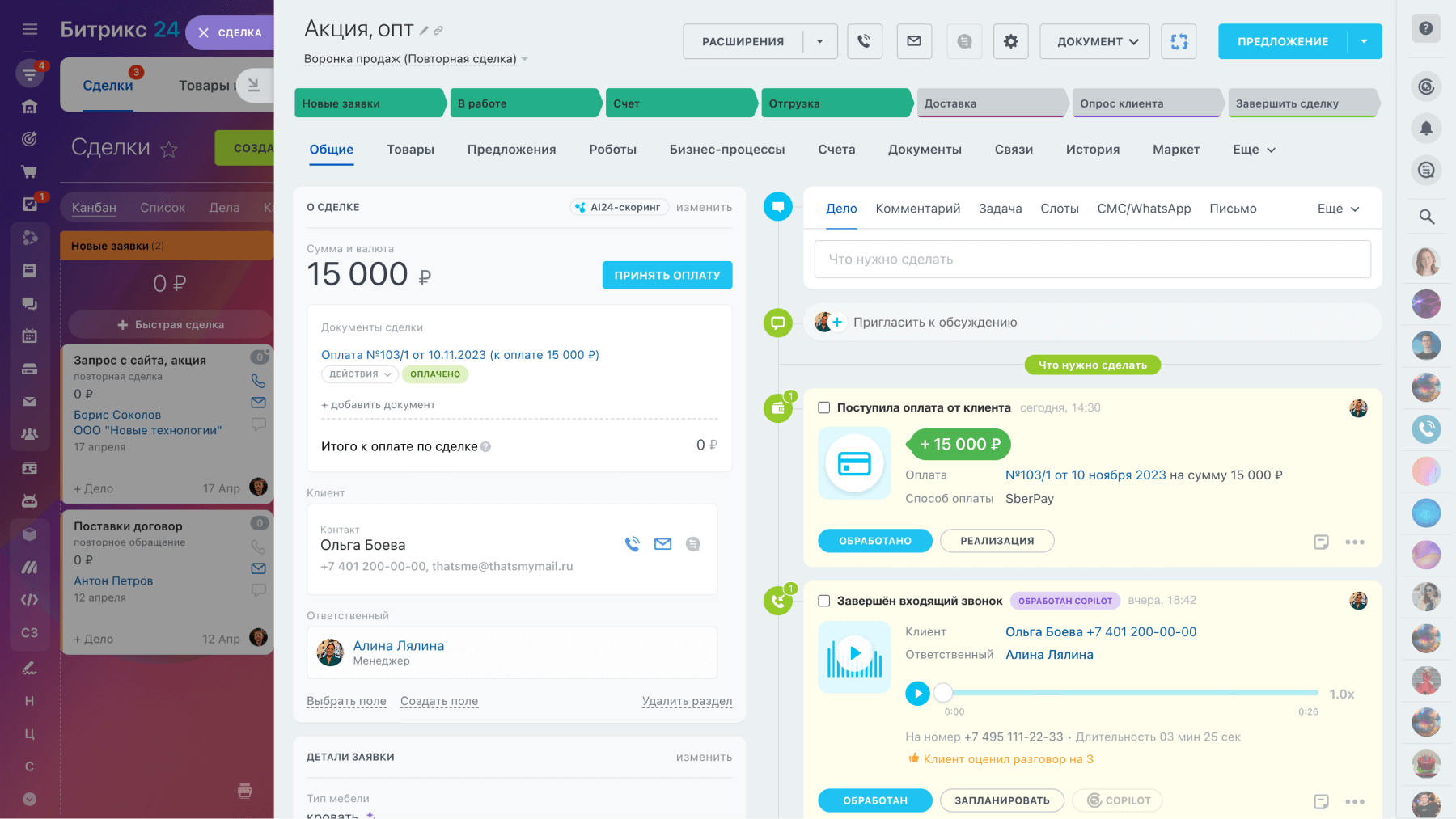 Весь процесс оплаты отображается в карточке. Вы видите, ушла ли клиенту ссылка, перешел ли он по ней и оплатил ли заказ.