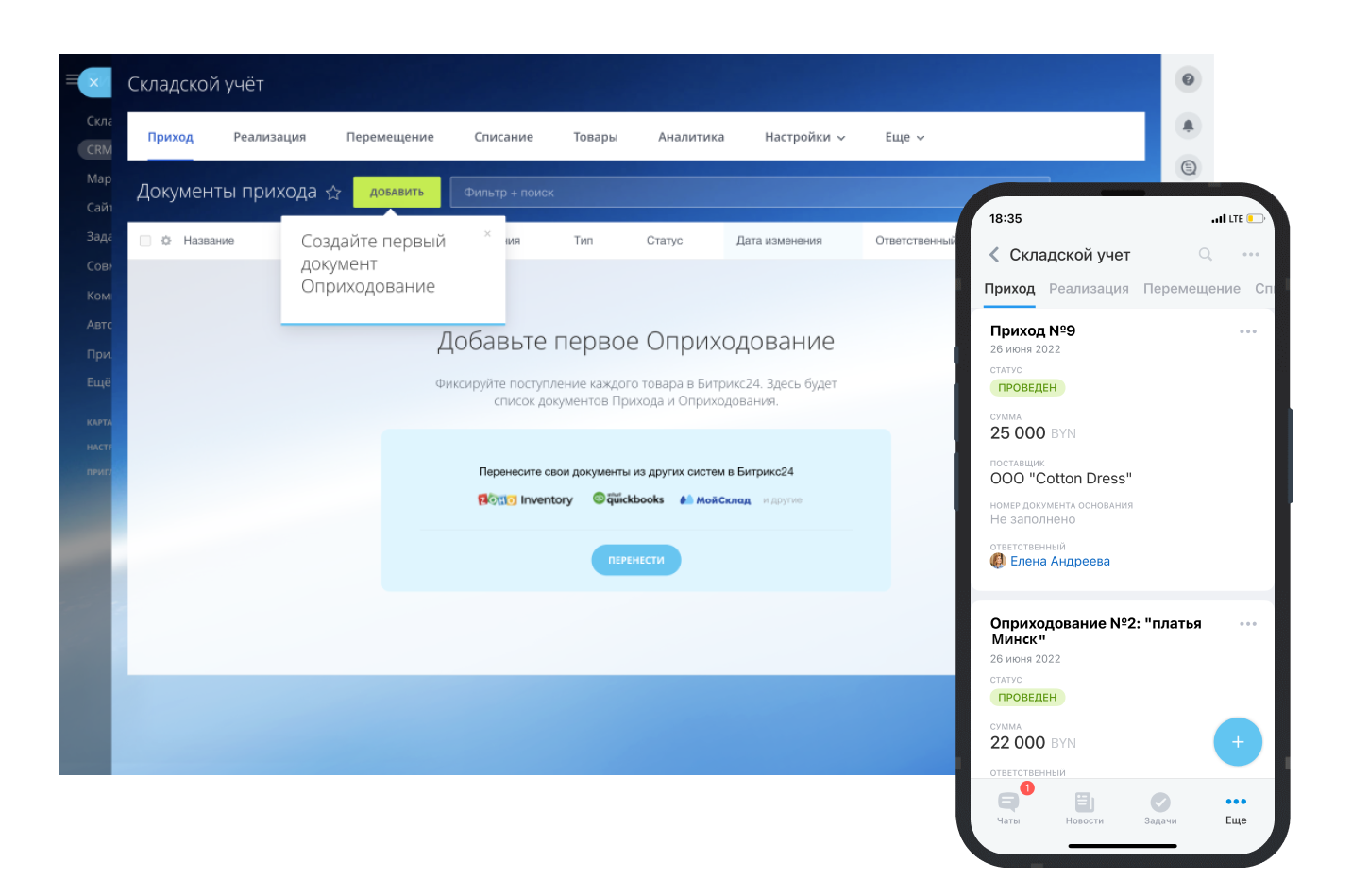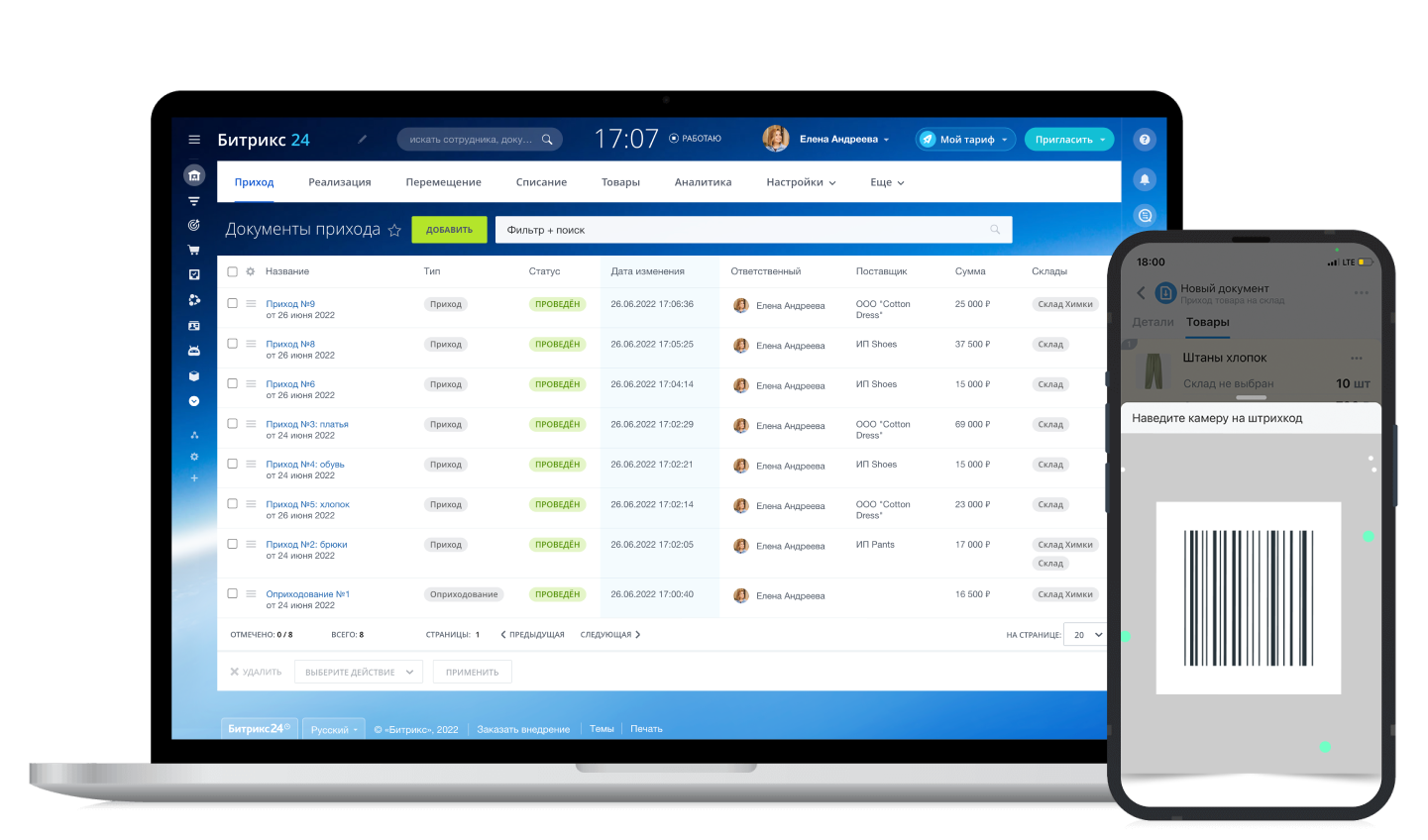 Вы и ваши сотрудники смогут быстро проверять наличие товара и отвечать клиентам, оперативно пополнять и распределять остатки.