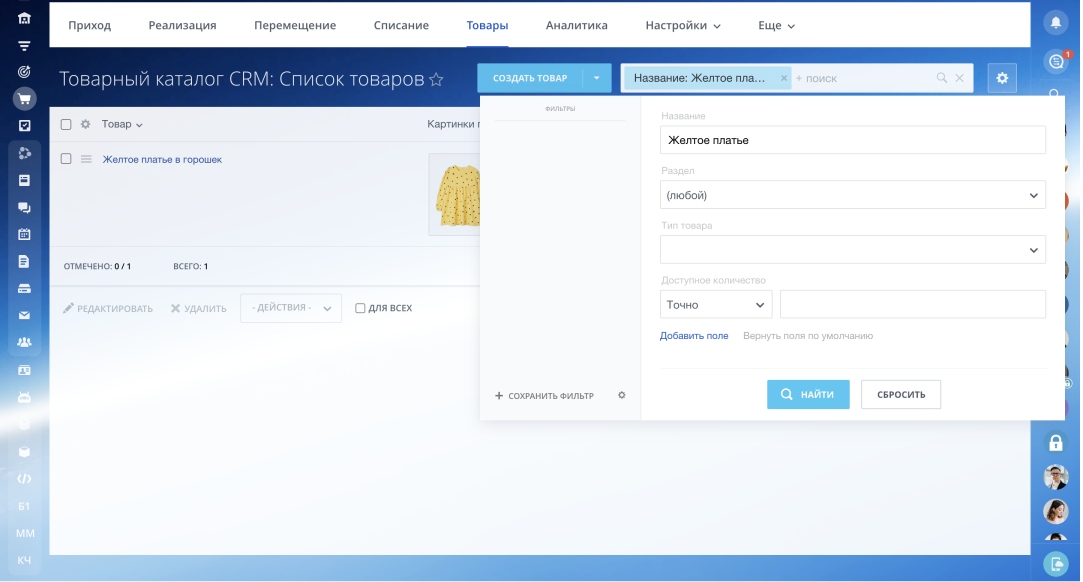 Прямо во время разговора с покупателем быстро найдите товар на нужном складе. Умный поиск поможет отыскать, например, «желтое платье в горошек» с помощью фильтров по цвету, размеру и другим параметрам.