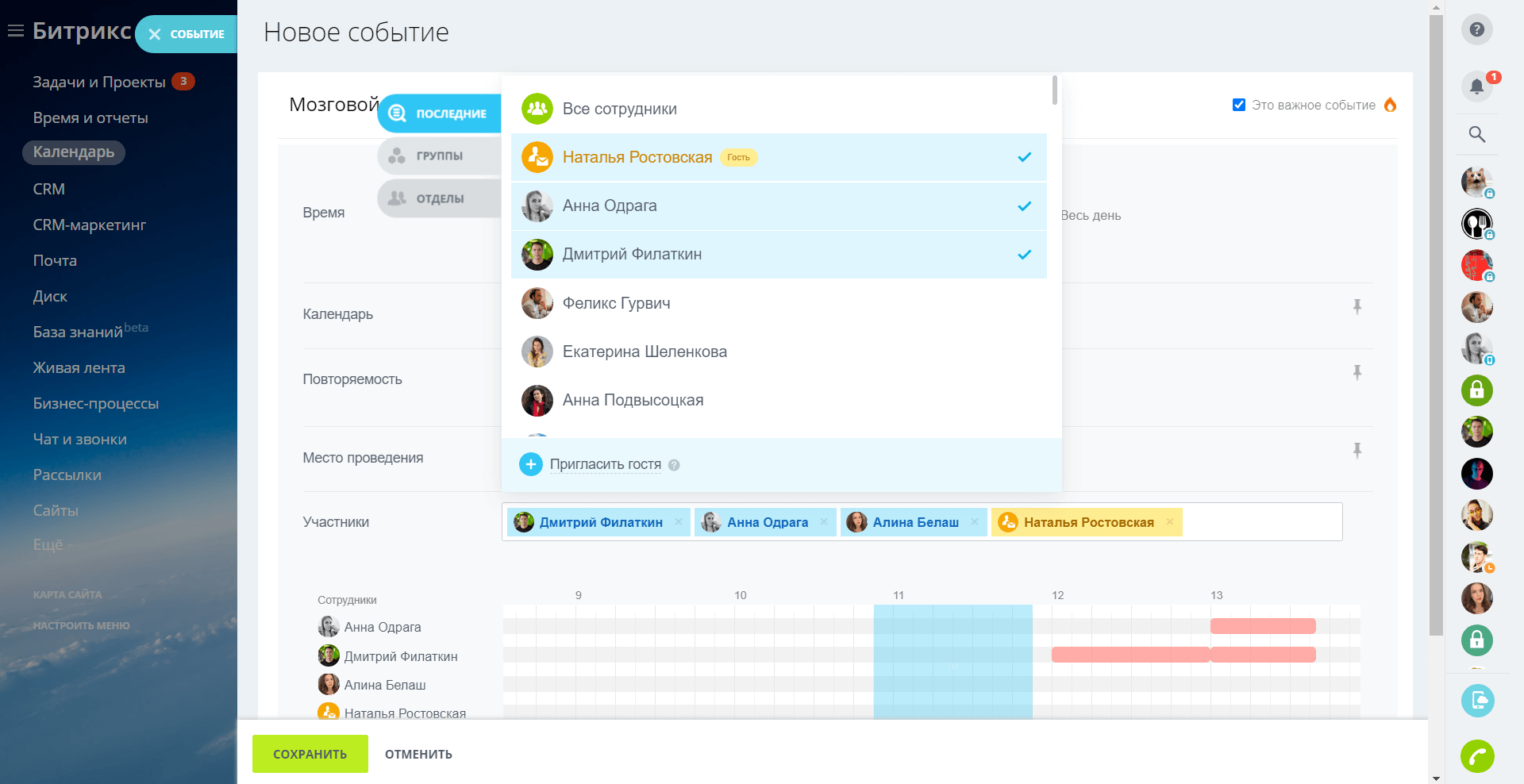 Для каждой встречи автоматически создается чат с сотрудниками, которые должны участвовать в обсуждении.