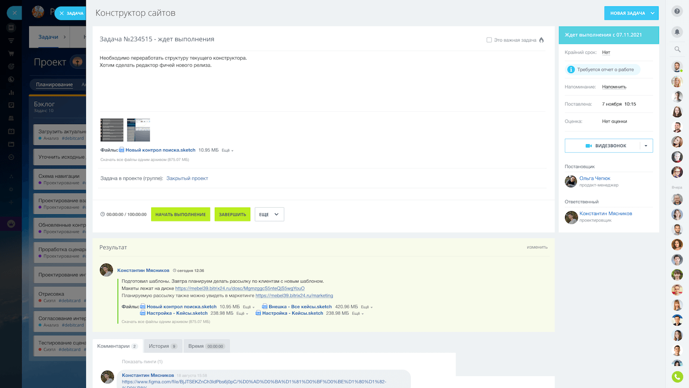 Прямо из задачи можно начать видеозвонок на всех участников обсуждения или создать общий чат.