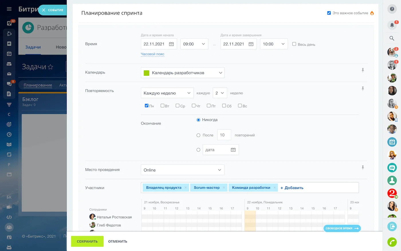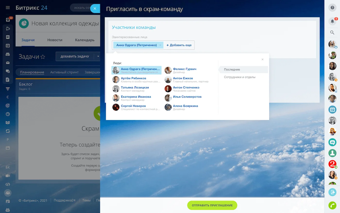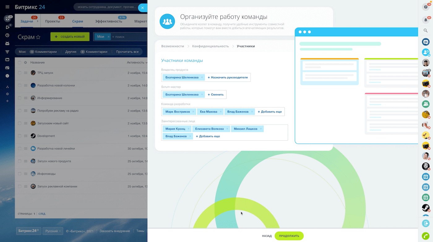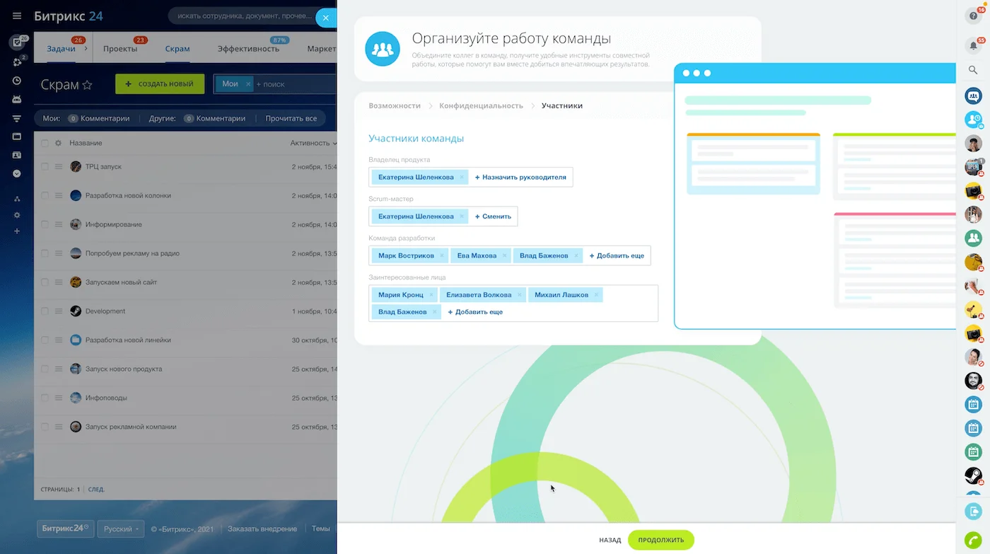 Попробуйте готовый сценарий в Битрикс24, чтобы организовать команду с нуля и сразу же приступить к работе. Вы можете создать до 5 скрам-команд для разных проектов бесплатно.