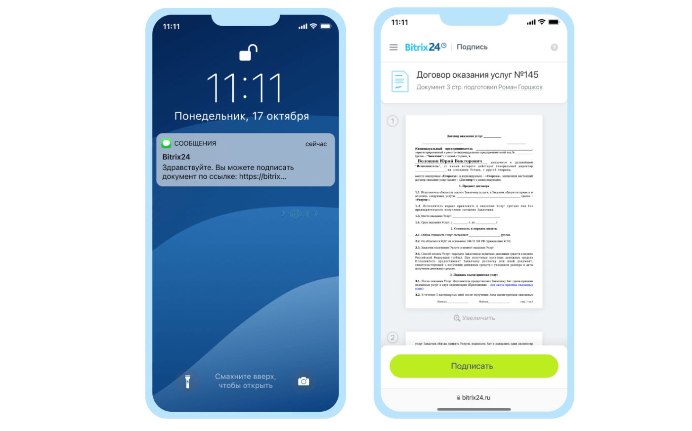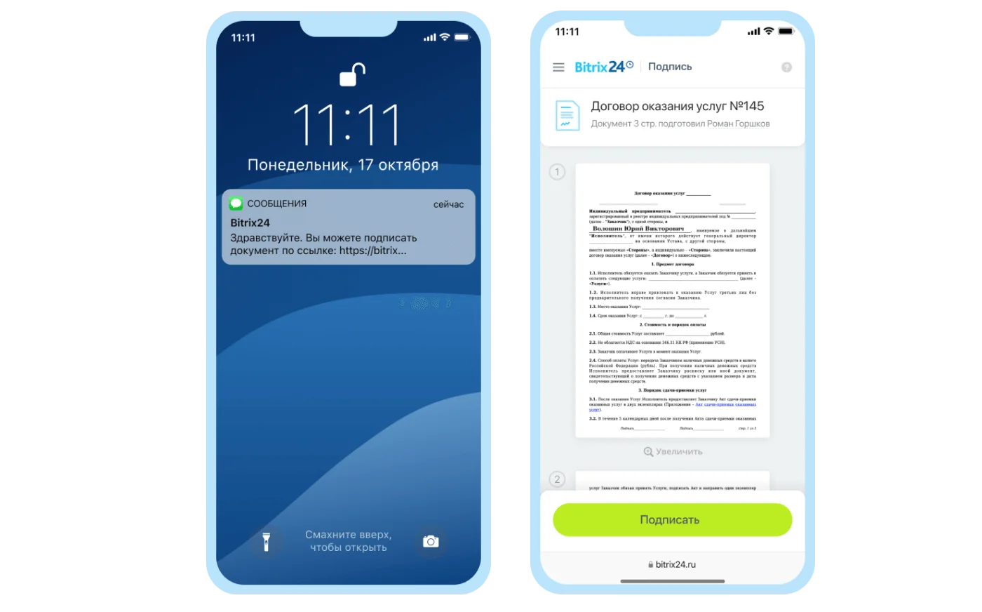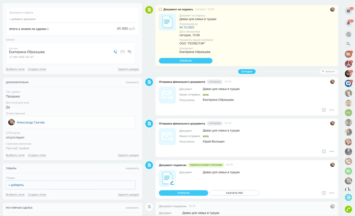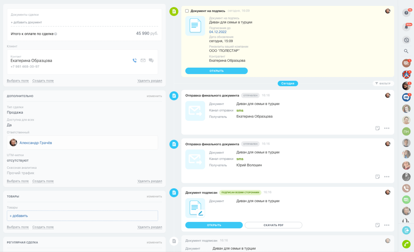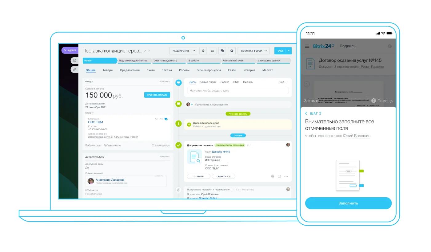 Пользоваться Подписью так просто, что вы будете удивлены. Отправьте документ клиенту по e-mail, SMS, WhatsApp. Для подписи ему даже не нужно регистрироваться в Битрикс24.