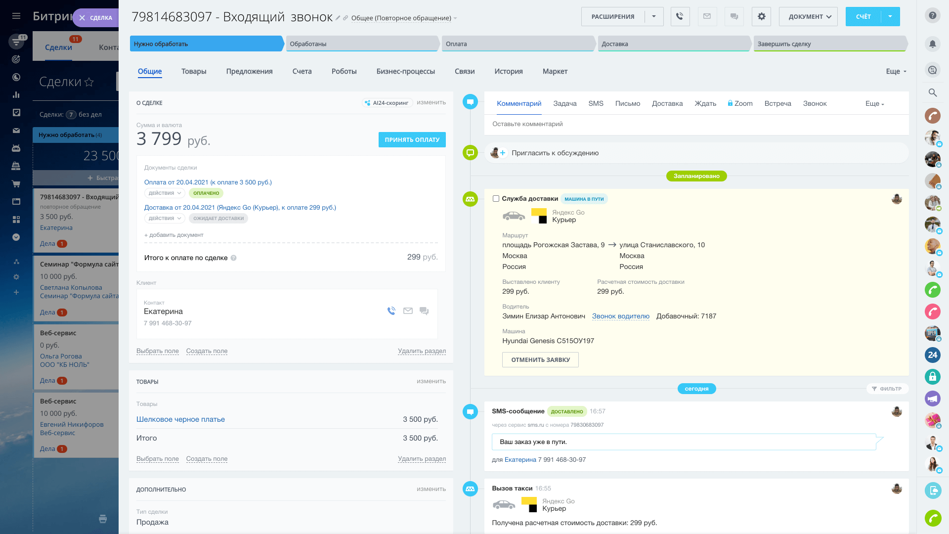 В CRM.Доставку встроена интеграция с Яндекс Go. Вы можете отслеживать статус доставки и в случае необходимости связаться с курьером, диспетчером или клиентом.