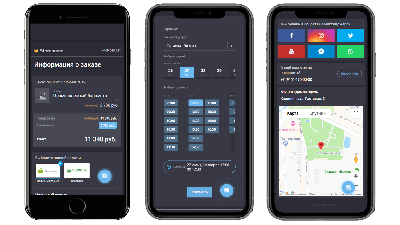 Страницы каталога, карточки товара и выбор записи на услугу и другие разделы отлично выглядят на мобильных устройствах. Клиент сможет сделать заказ, перейдя по ссылке в соцсетях и чатах.