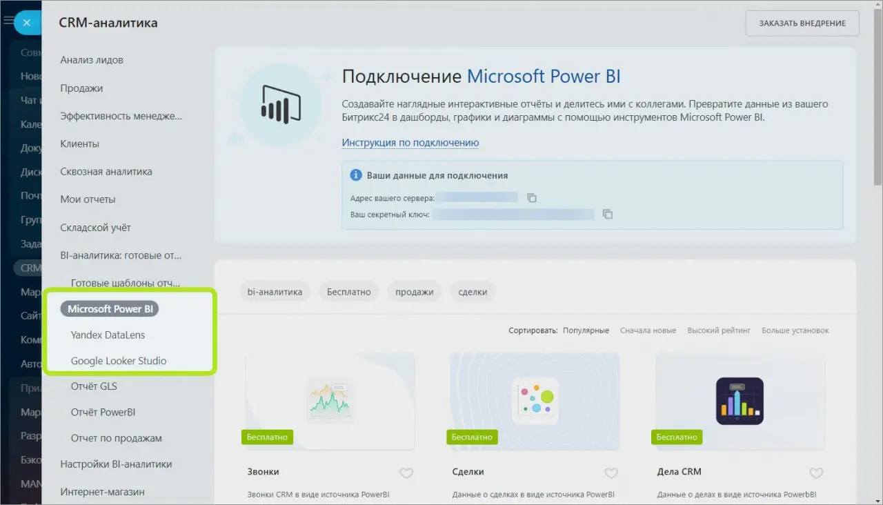 В Bi-аналитика в Битрикс24 поможет подключить Google Looker Studio, Microsoft Power BI или Yandex DataLens и создавать отчеты любой сложности, чтобы отслеживать необходимые показатели.