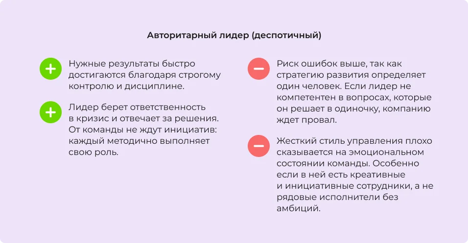 - Есть много классификаций лидерства: например, выделяют авторитарный, демократический и либеральный стили управления командой. Нельзя сказать, что один стиль лучше другого, поэтому при выборе учитывайте опыт и мотивацию сотрудников.