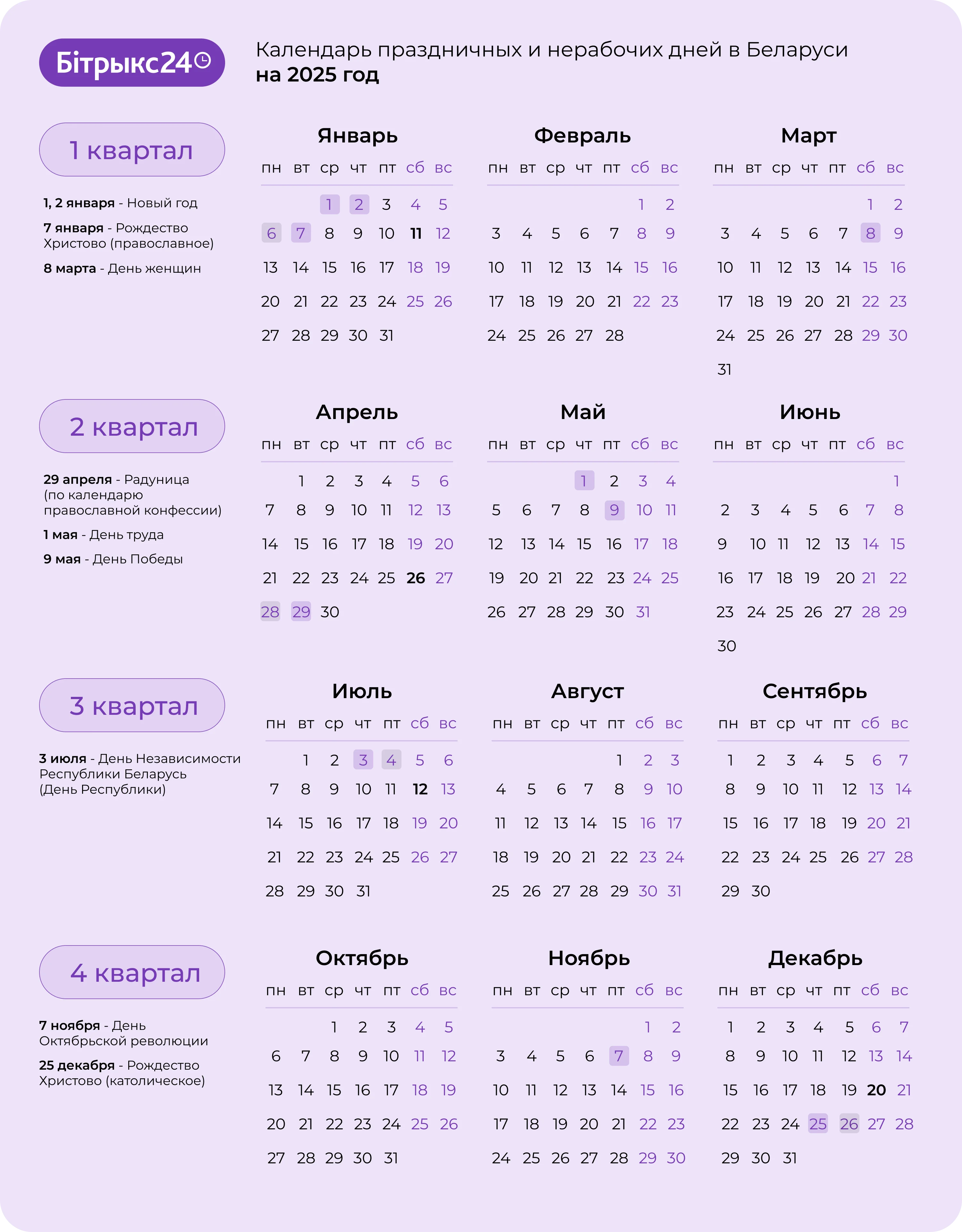 Производственный календарь РБ на 2025 год с праздниками, выходными днями и переносами.