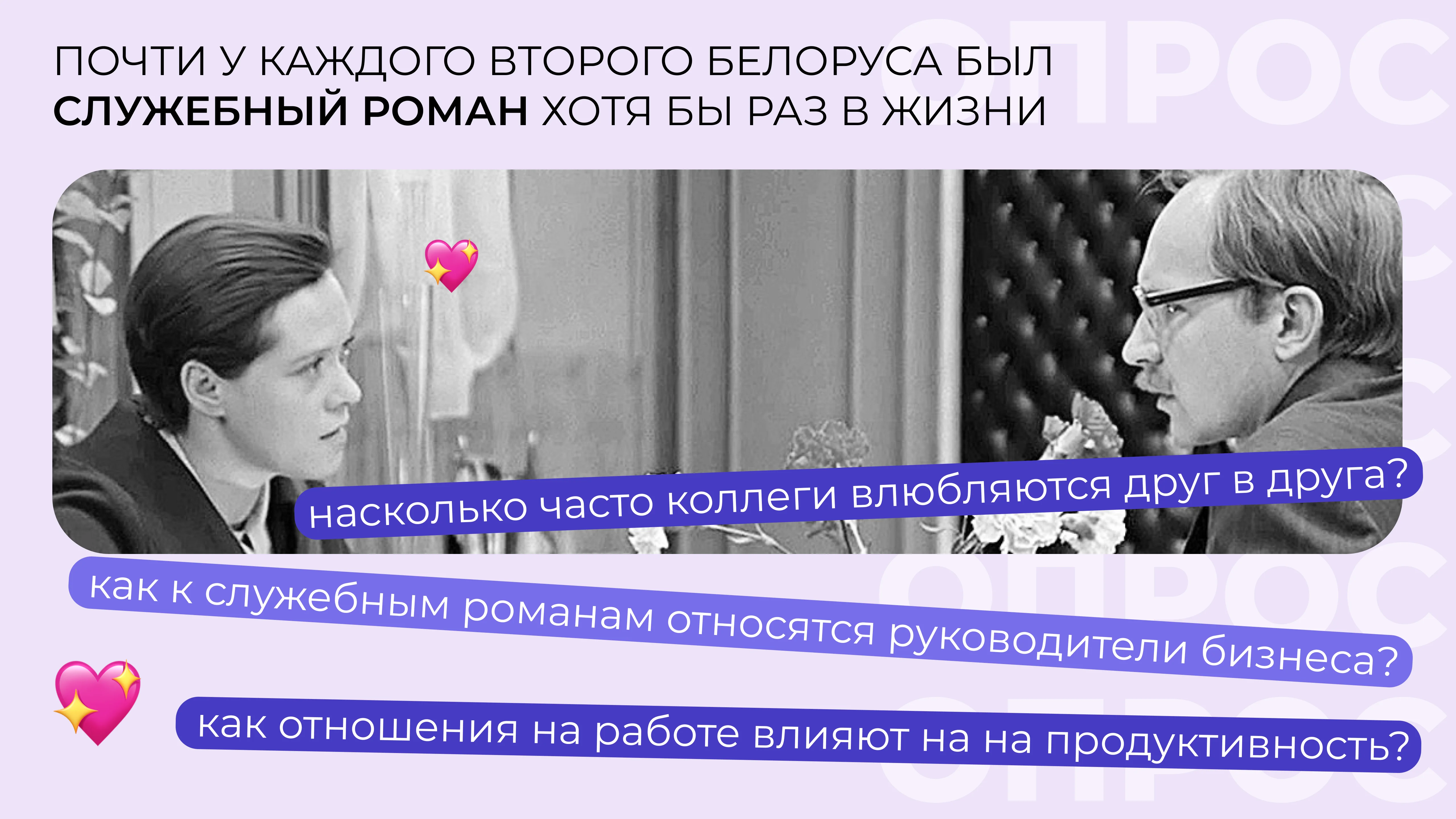 А как выглядит любовь в офисе, когда за ней не стоит сценарий фильма? Аналитический центр «Бiтрыкс24» провел исследование среди 300 белорусских компаний, чтобы разобраться, как к служебным романам относятся руководители бизнеса, как отношения на работе влияют на на продуктивность.