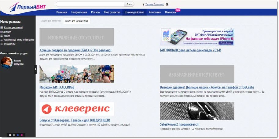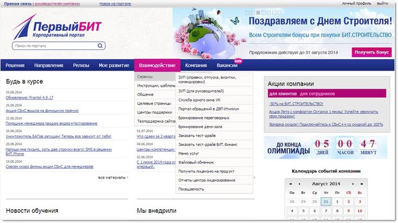 Также мы смогли увеличить уровень приятия персоналом корпоративной культуры «Первого БИТа». Помимо донесения до каждого сотрудника ее основных составляющих на это повлияло всеобщее информирование о новостях компании, наших общих успехах, реализация инструментов взаимопомощи через портал. Работает внутренняя служба поддержки корпоративного портала, активно собираются и воплощаются в жизнь пожелания по усовершенствованию системы.