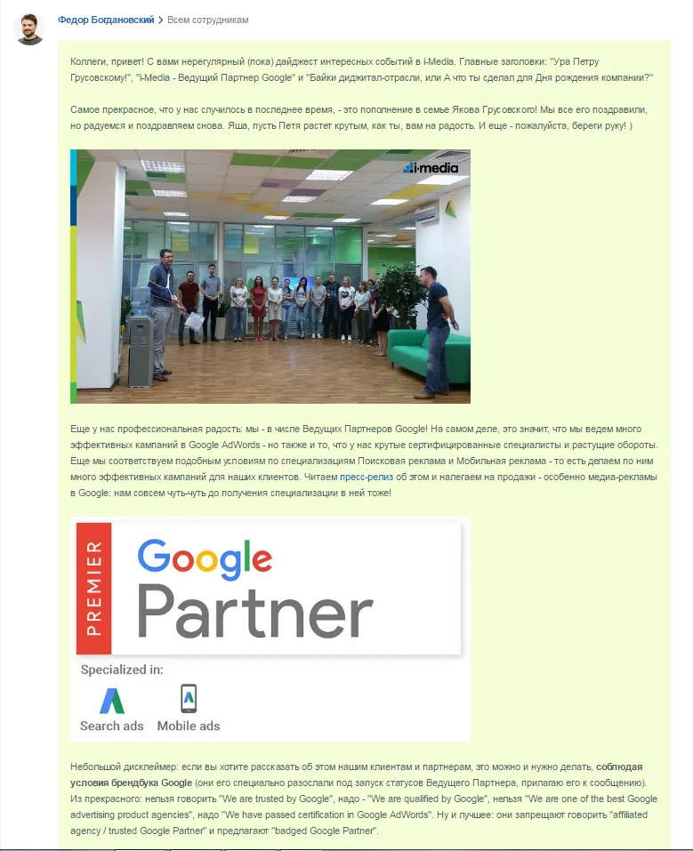 Пока еще сохранилась привычка использовать электронную почту для внутренних коммуникаций. Автоматизм подводит даже самых лояльных коллег. Но коллектив агентства i-Media сплочен и дружен. Поэтому основным инструментом смены шаблонов выбрано мягкое авторитетное убеждение. Анна Караулова приводит два примера.