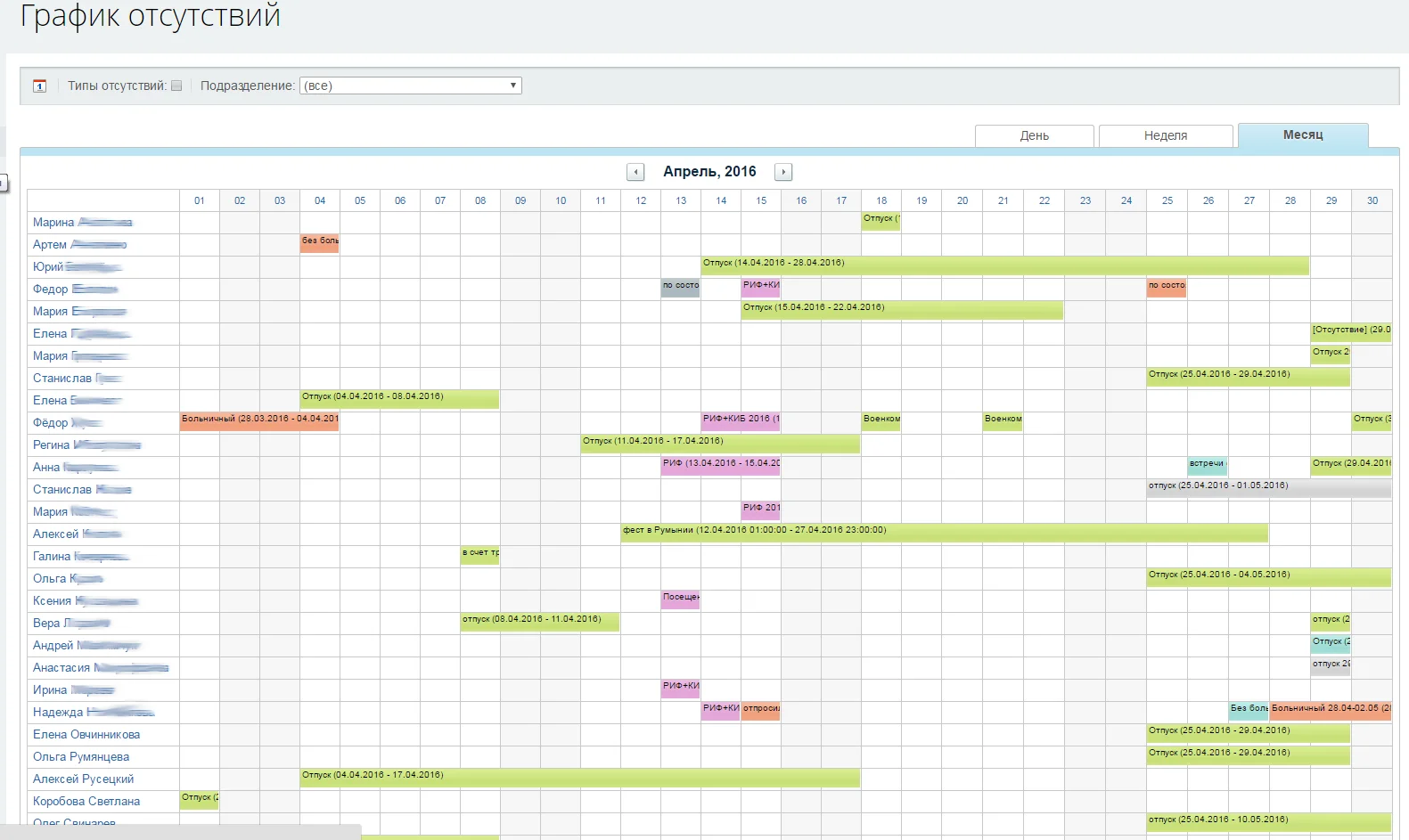Также мы внедрили прекрасный инструмент – «График отсутствий». До этого сотрудник на всю компанию писал: «Коллеги, я в отпуске!» Это хорошо, когда в компании десять человек или двадцать, но не сто сорок, из которых некоторые не знают друг друга в лицо. Теперь, когда кто-то пишет «письма счастья», то я либо кто-то из администрации отвечает: «Дорогой, пожалуйста, больше не пиши такого. А вот тебе новый инструмент, его надо заполнить».
