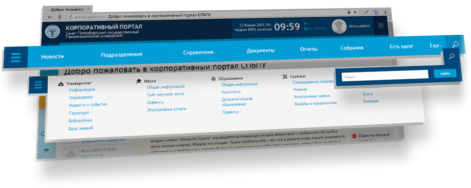Интранет-ресурс помог сотрудникам научной части, а также специалистам образовательных институтов, входящих в состав вуза и тем, кто работает в международных и инфраструктурных службах университета, снять общую проблему, связанную с обменом информацией между подразделениями, начать быстро и просто ориентироваться в сложной структуре СПбПУ, его многочисленных документах, требованиях к тем, кто ведет научную работу, в важных событиях, решениях, информационных потоках и регламентах.
