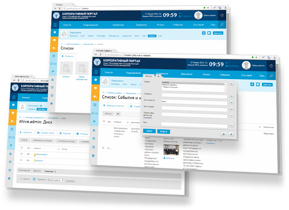 — Да. Одна из самых актуальных проблем при внедрении корпоративного портала — вовлечение сотрудников в работу с незнакомым ресурсом. Понимая, что заставить людей не получится, мы, вместе с руководством университета, решили создать удобные сервисы, которые нужны в ежедневной работе каждого сотрудника научной части. И которым нет альтернативы в других имеющихся в университете веб-ресурсах и системах! Например, сервис записи на прием к проректору по научной работе — с календарем, где видны уже занятые часы и дни, командировки и иные причины отсутствия коллег. И, знаете, у нас получилось привлечь внимание людей и показать им, что портал, действительно, помогает работать.