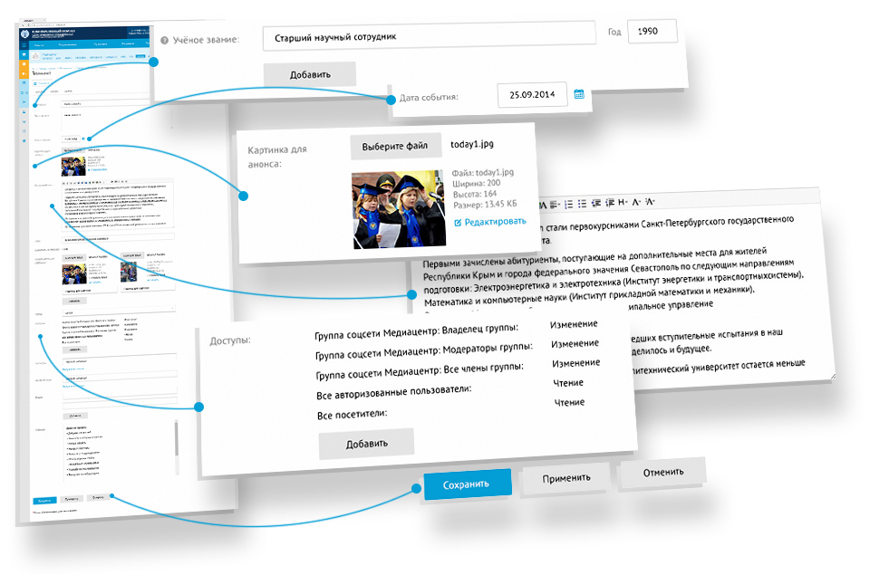 Привести в порядок веб-ресурсы более 100 разных подразделений университета удалось за счет входящего в лицензию бесконечного количества сайтов и использования «Универсальных списков рабочих групп». С помощью групп, созданных для наполнения конкретных сайтов, сотрудники, отвечающие за эту работу, могут добавлять и редактировать контент в любой момент. Без доступа к «админке», которой многие из них, по понятным причинам, боятся. И без прохождения онлайн-курсов по контент-менеджменту. Еще один плюс этого решения — более простое и привычное (как в социальных сетях) включение новых людей в работу над содержимым нужного сайта. Человека достаточно пригласить в рабочую группу, посвященную соответствующему ресурсу. А вот администратора, который давал бы доступ к «Инфоблокам», где хранится информация, которую нужно менять или редактировать, дергать уже не нужно.