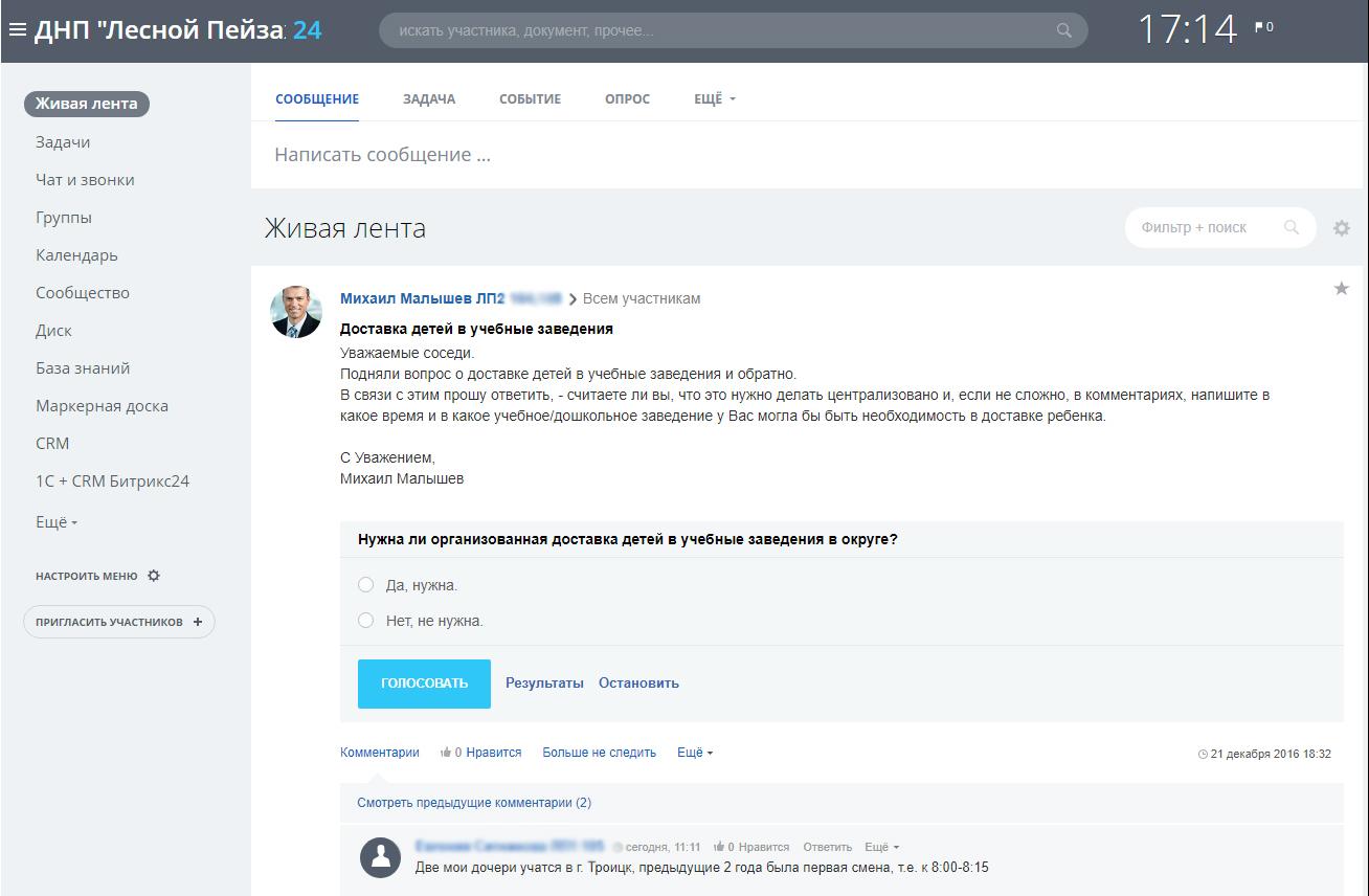 Голосования в онлайне пока не имеют юридической силы, поэтому «Битрикс24» полностью не заменит формальные встречи. Но сервис уже ускорил процедуру принятия решений, теперь жители в курсе последних новостей. Соседи больше общаются и вместе планируют, как сделать жизнь в «Лесном пейзаже» лучше.