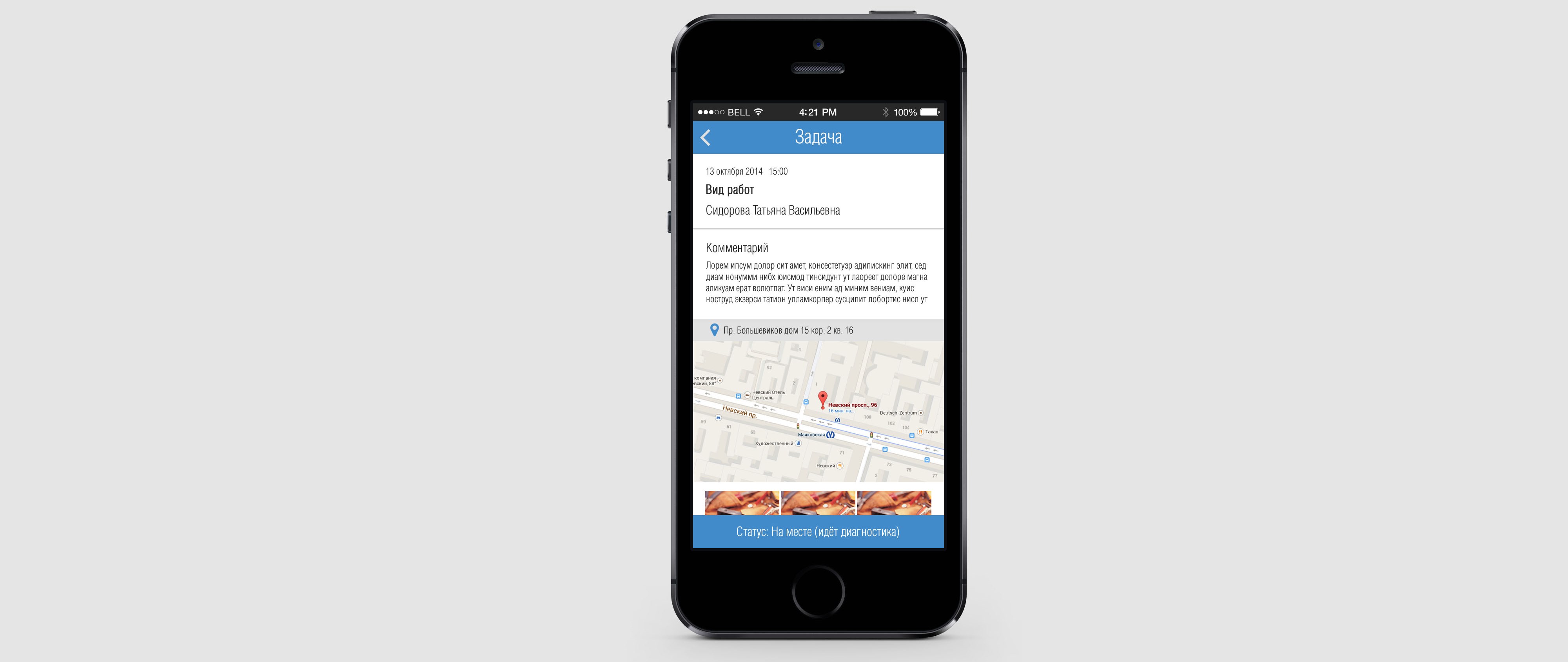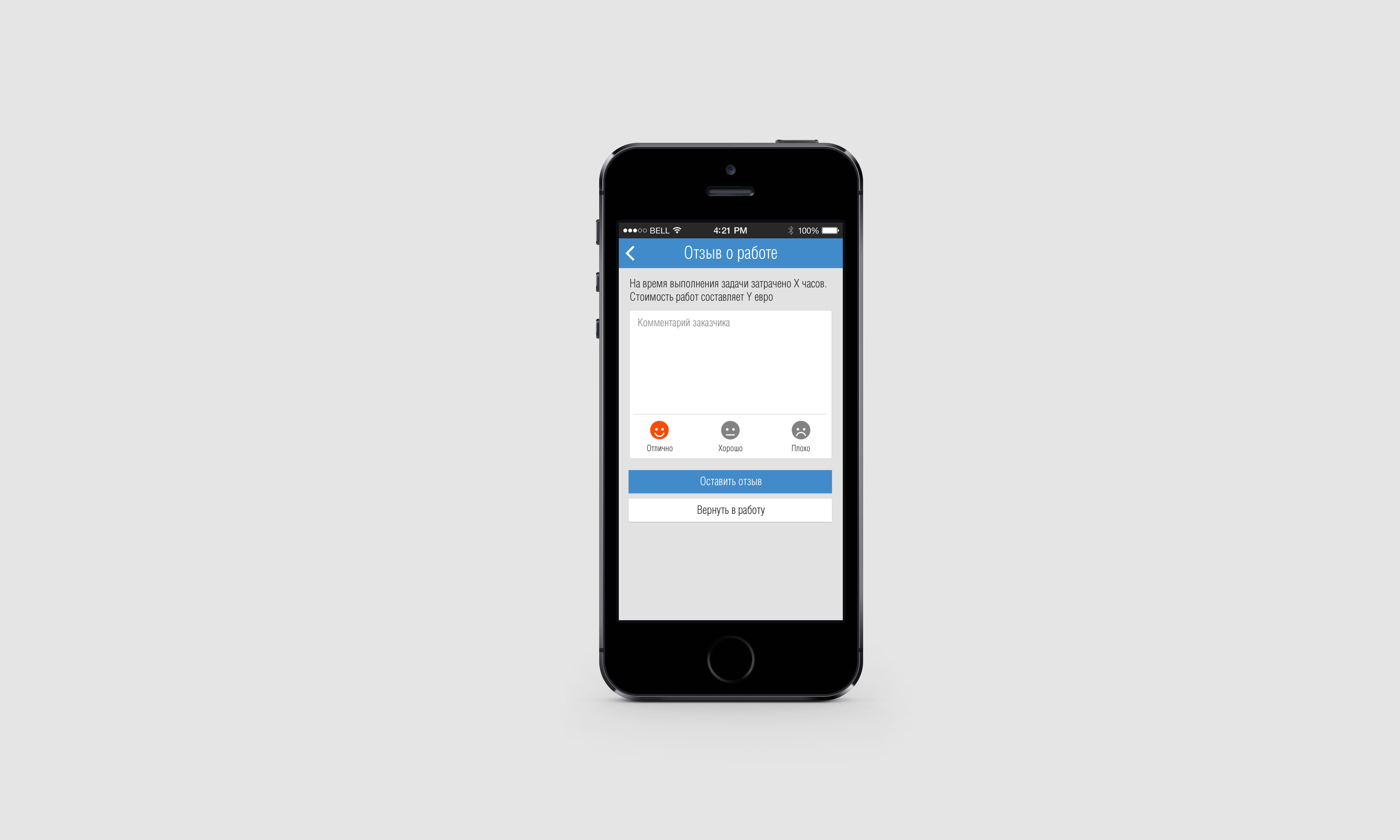 После того, как мастер завершает задачу и нажимает соответствующую кнопку, он отдает планшет заказчику работ. В приложении открывается «клиентская» форма, в которой заказчик может тут же написать комментарий к работе и поставить мастеру оценку. Там же клиент видит количество отработанных исполнителем часов и стоимость работы. При этом сохраненные комментарий и оценка мастеру не видны. Он видит только, что задача завершена и он может ехать в следующее место.